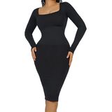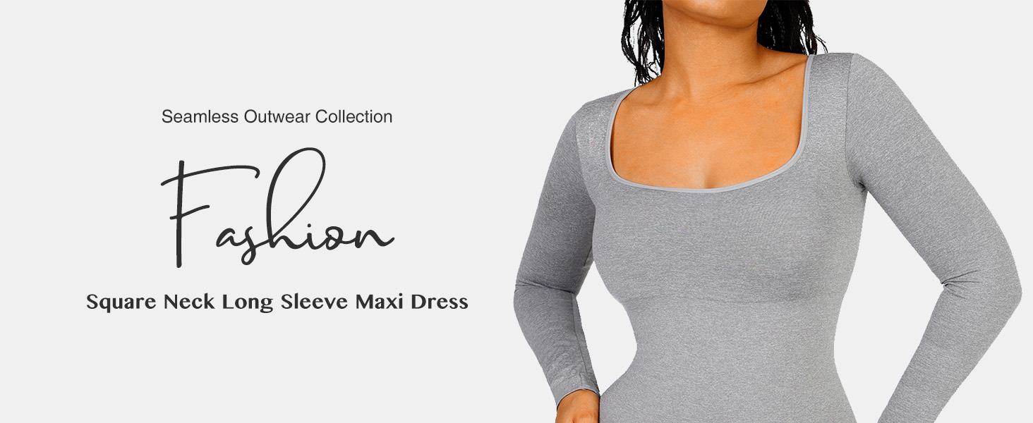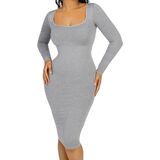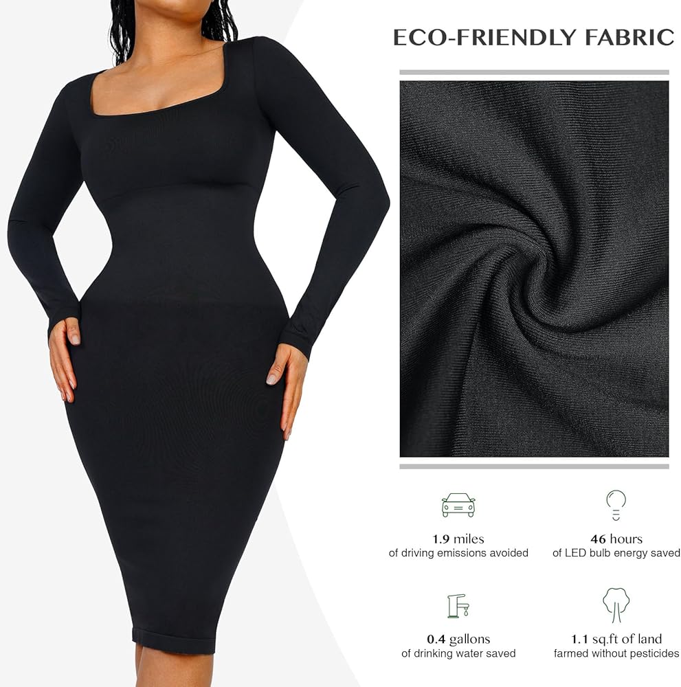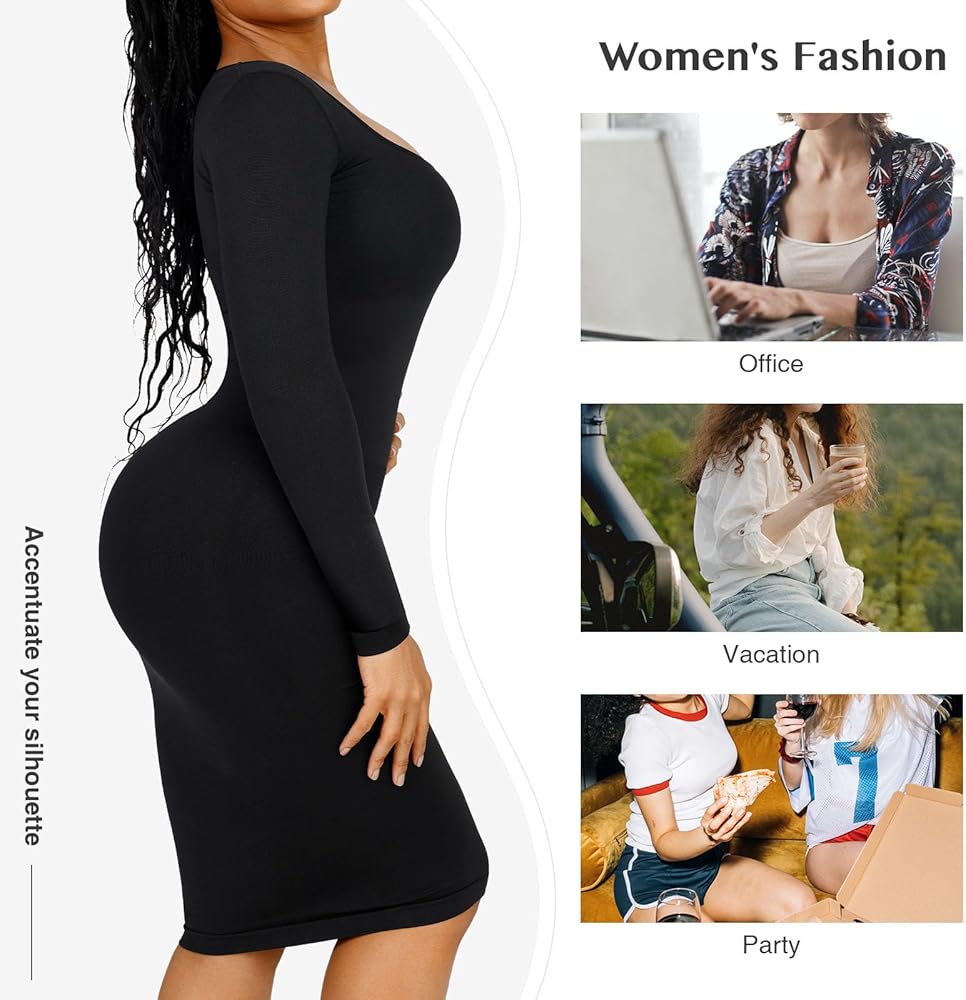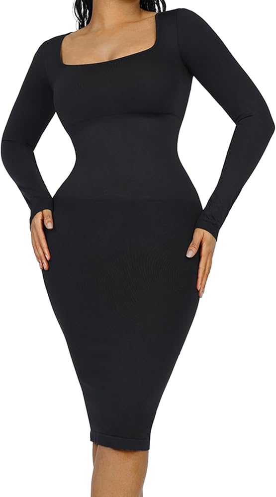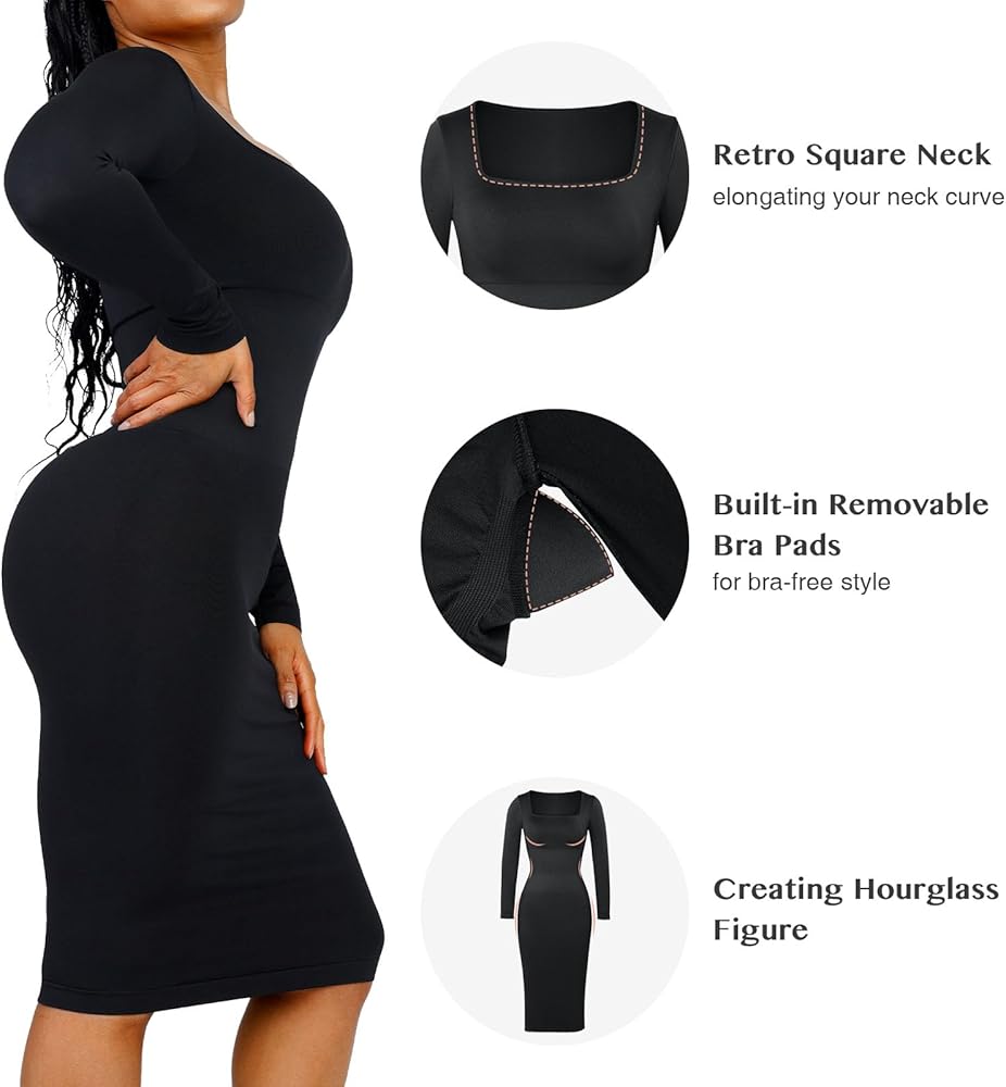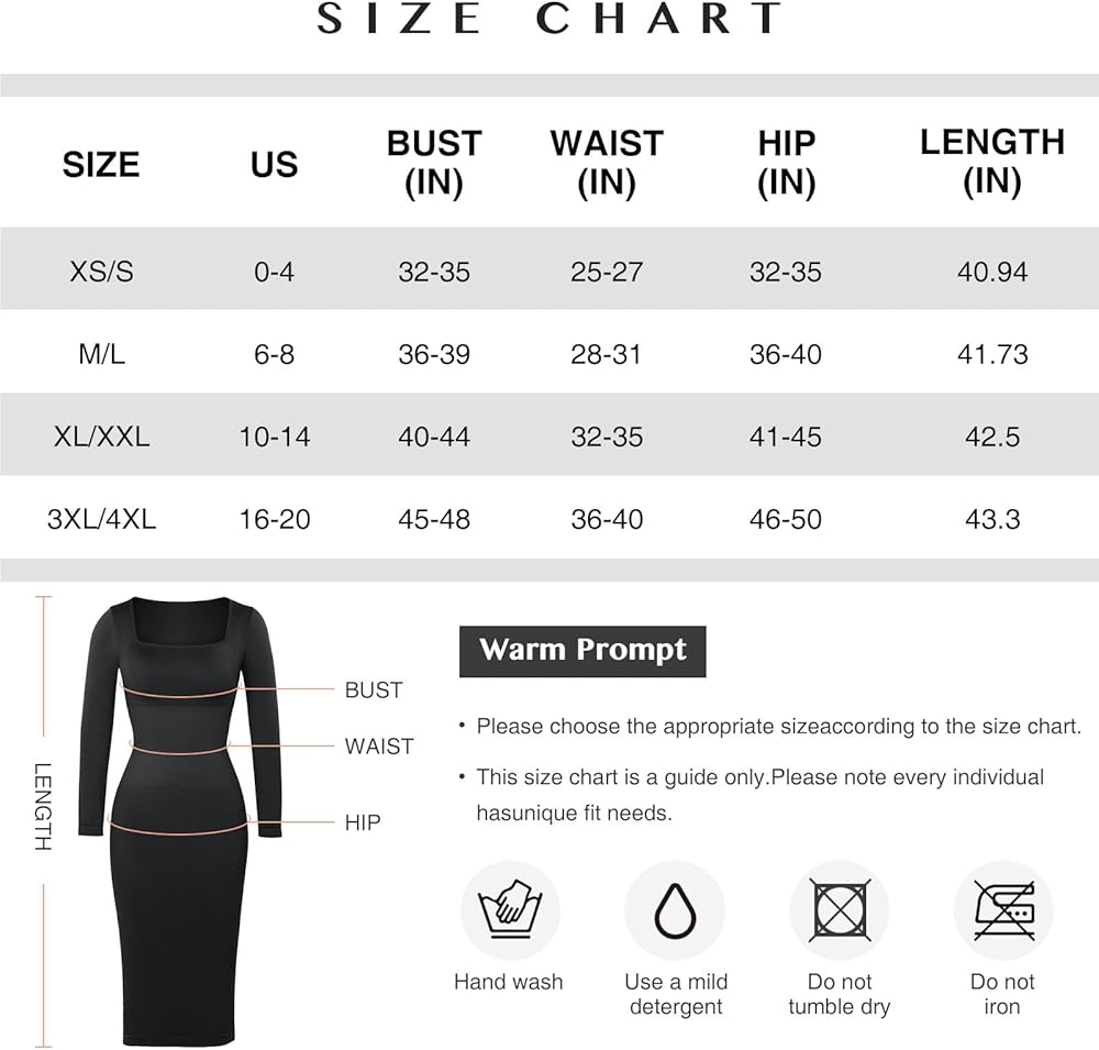 • فستان طويل الأكمام برقبة مربعة: بينما يحتضن فستان Bodycon الطويل منحنياتك أسفل الخصر المناسب. بفضل المادة المرنة التي تحتضن شخصيتك بشكل مثالي وتخلق القصة الضيقة صورة ظلية مغرية. لتعديل خطوط جسمك، فإن طول الركبة واللف على البطن يجعلك تبدو أنحف ويطيل طول ساقيك.