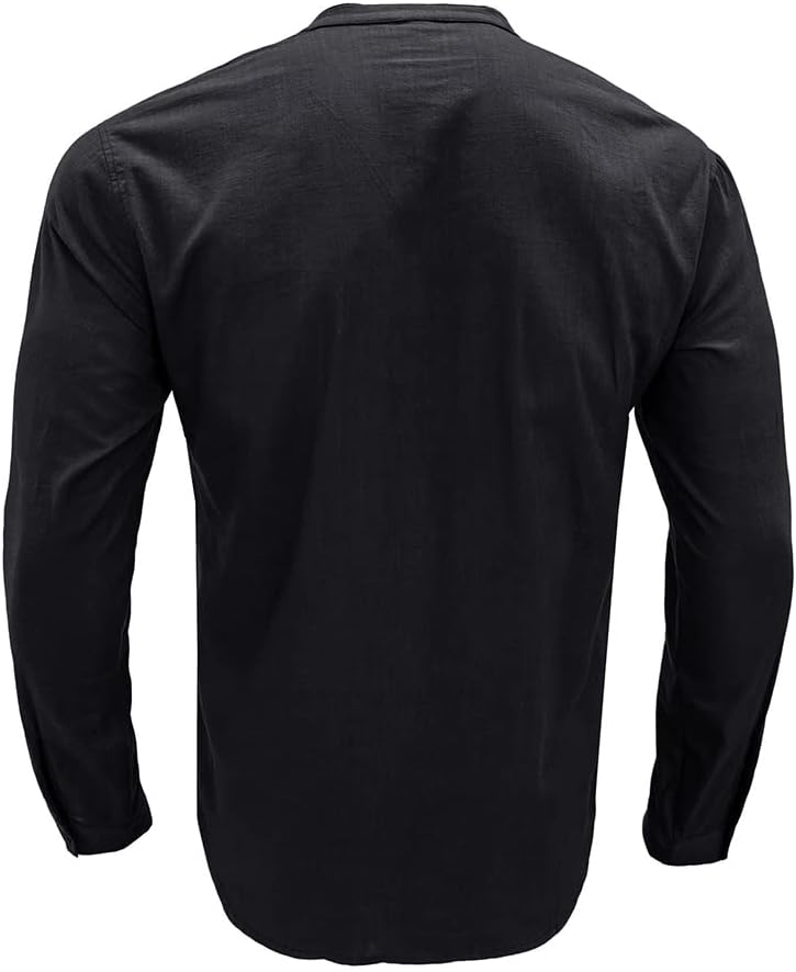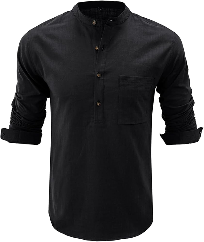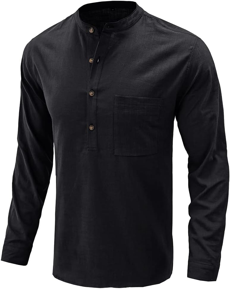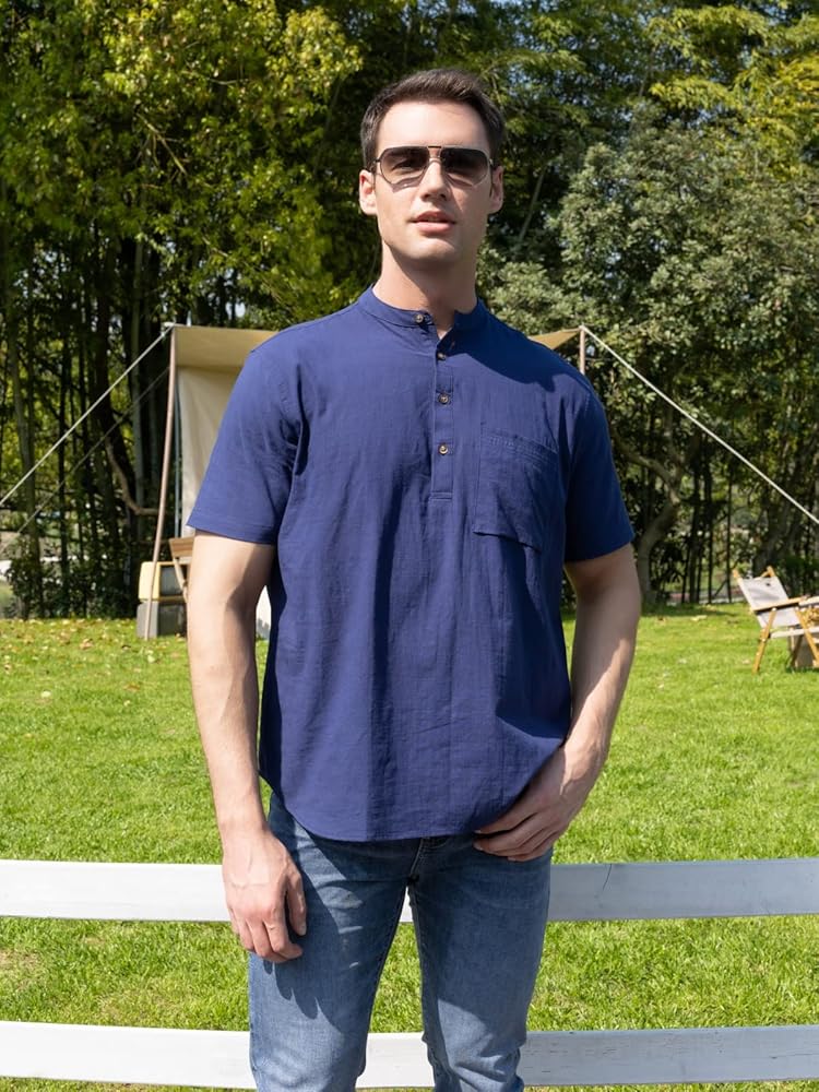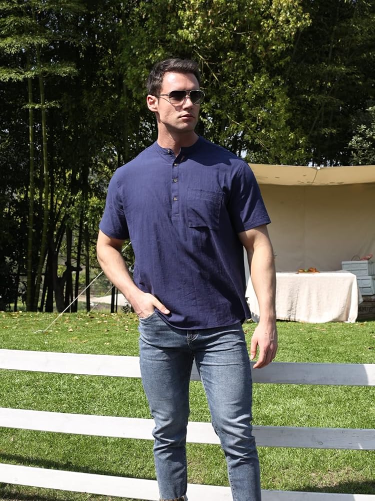 تصميم فريد: قمصان هينلي من الكتان الكاجوال للرجال، ياقة شريطية، لون ثابت، مقاس نحيف، كم قصير، إغلاق بأزرار سفلية، وجيب على الصدر.