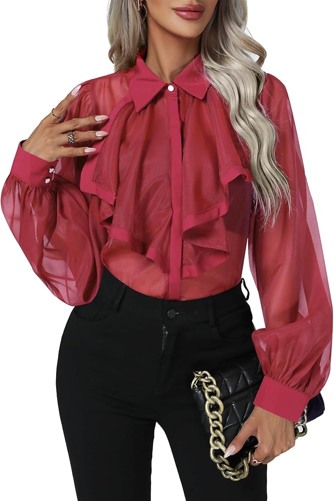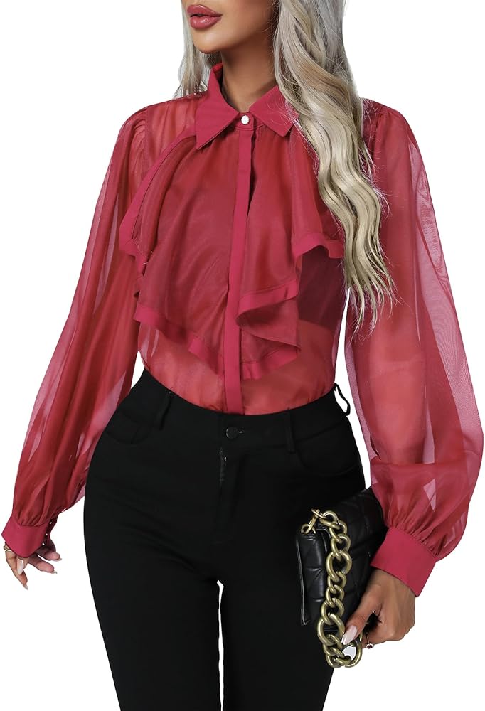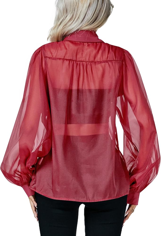 المزايا: بلوزة شبكية شفافة تتميز بتصميم ياقة على شكل حرف V، وأكمام طويلة، وأزرار سفلية، وأساور أكمام بأزرار، وشبكة شفافة، ومثيرة، ويضيف الإبهام الذي يمر عبر الأساور إلى أناقة هذه البلوزة.