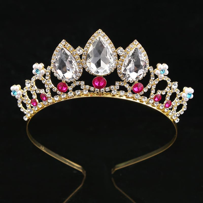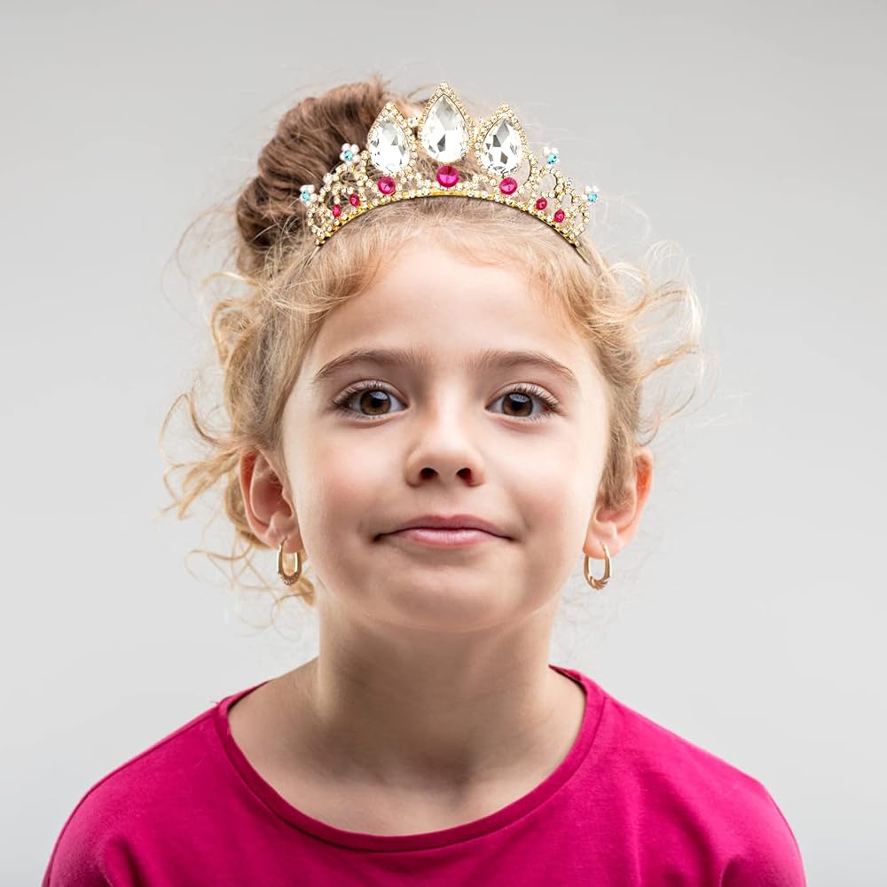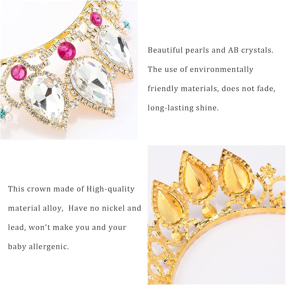 التفاصيل----تم تعزيز كل حجر الراين واللؤلؤ في تاج الأطفال لمنعهم من السقوط بسهولة. تتم معالجة المنطقة التي يتم فيها طلاء عصابة الرأس الذهبية وتوصيلها لتصبح ناعمة، مما يمنع خدوش فروة رأسك ويجعلك أكثر راحة عند ارتدائها.