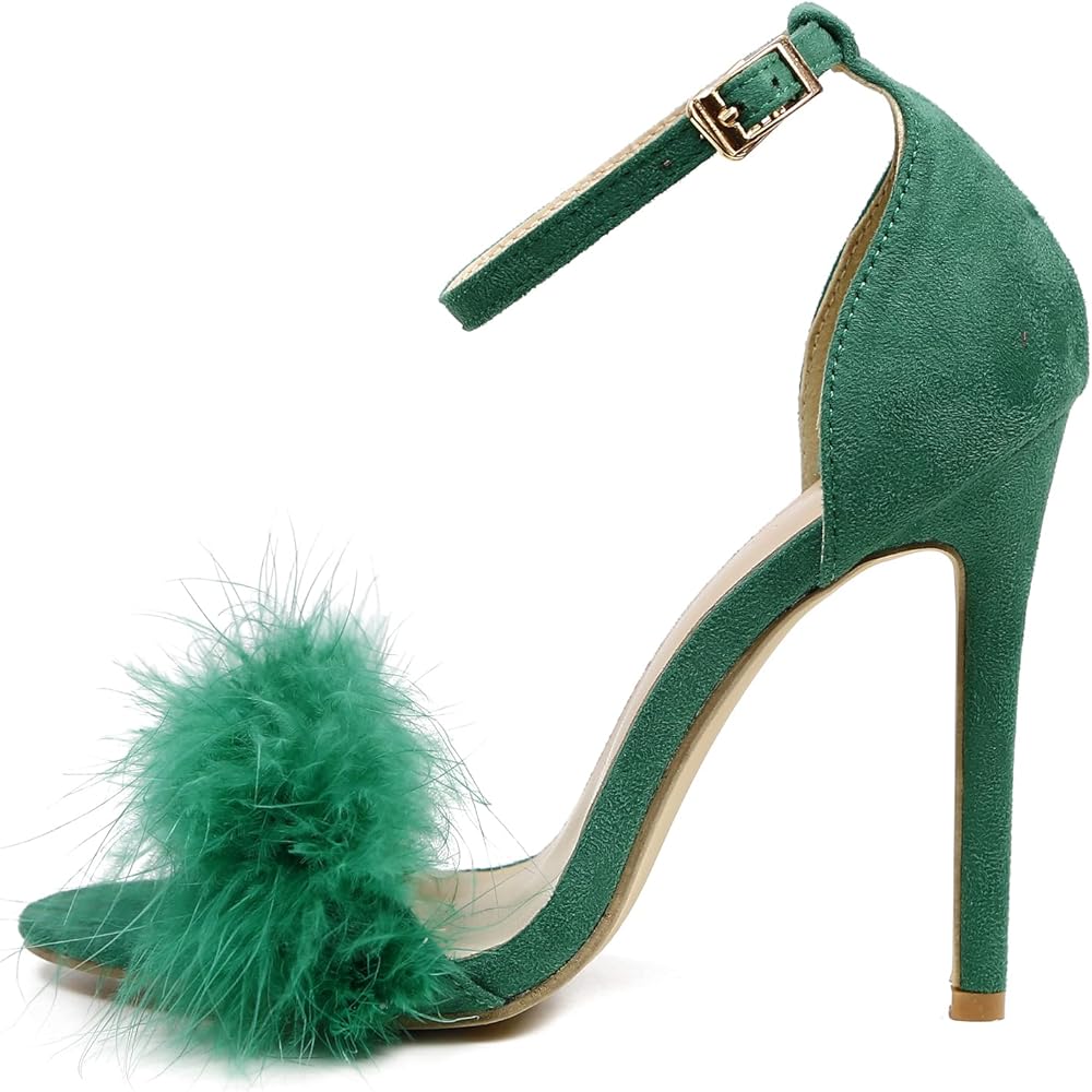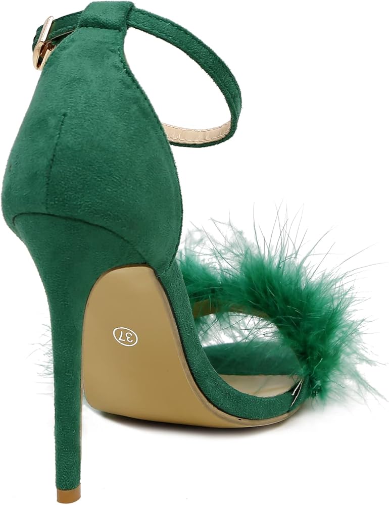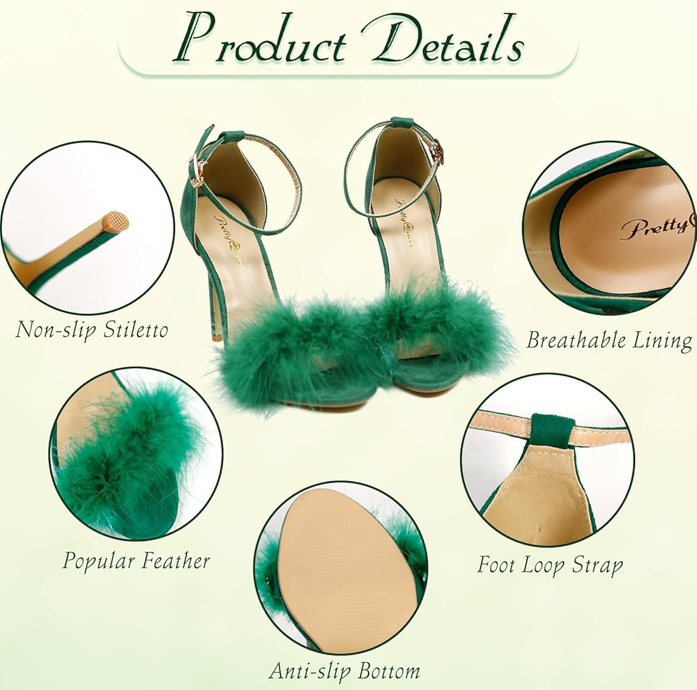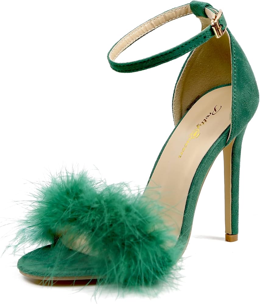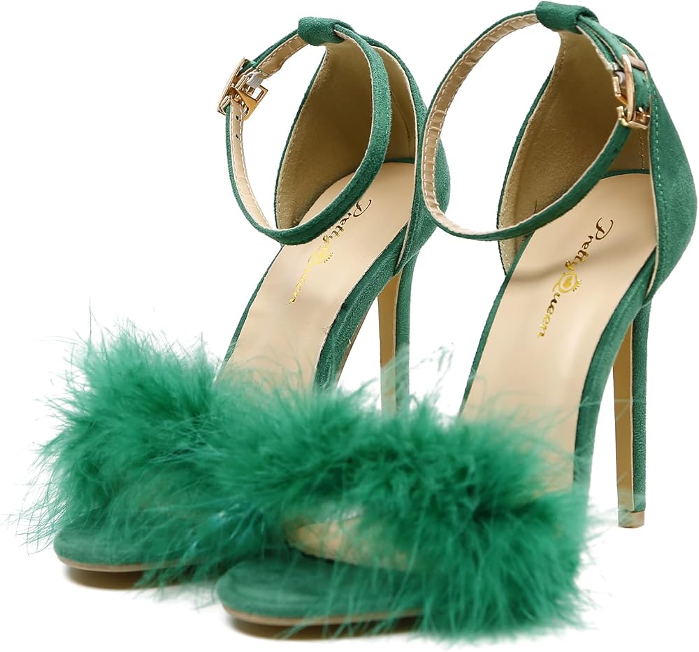 👠 تصميم فريد: تصميم فريد من نوعه من الريش المنفوش، مقدمة مفتوحة، كعب ستيليتو، وحزام بإبزيم للكاحل.