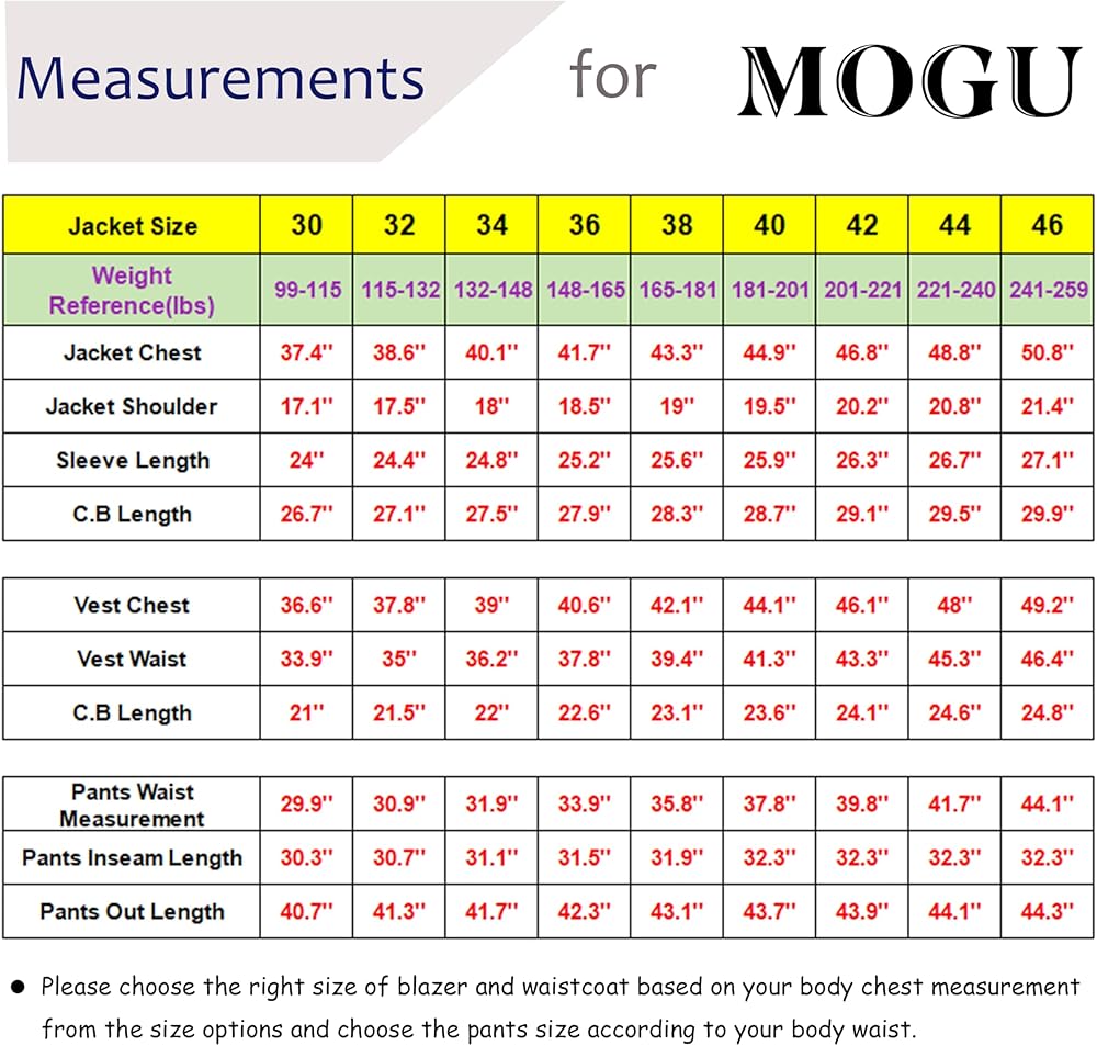 مقاس 34 مناسب لجسم الصدر 34 بوصة، الكتف 16.1 بوصة، الصدر 37.8 بوصة، طول الكم 24.8 بوصة، طول الملابس 26.4 بوصة، خصر البنطلون 31.0 بوصة، طول الدرزة الداخلية 31.0 بوصة