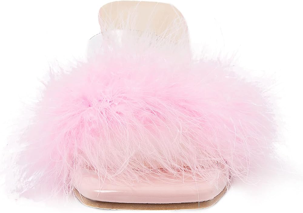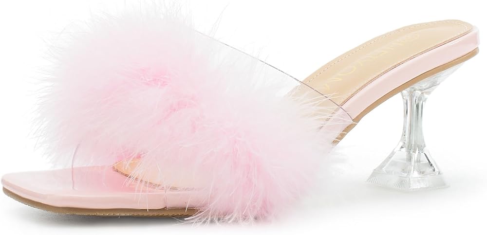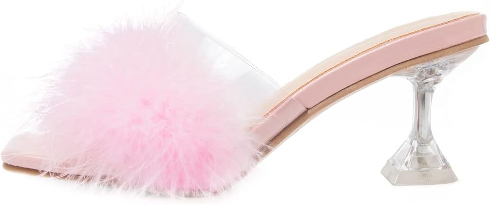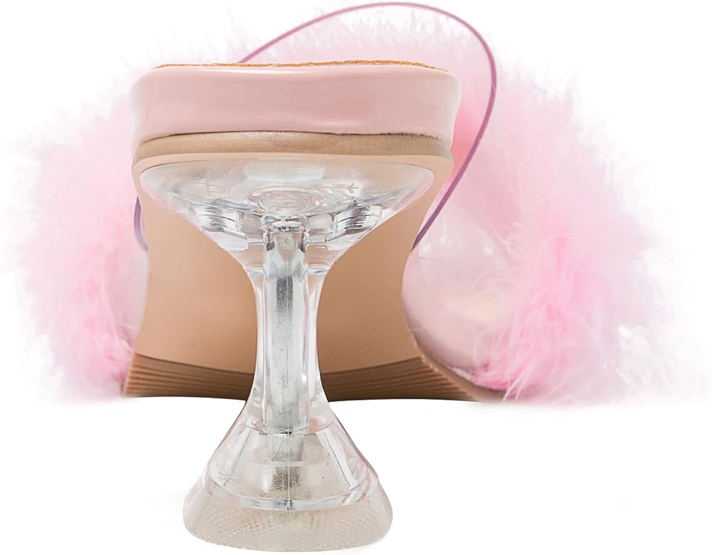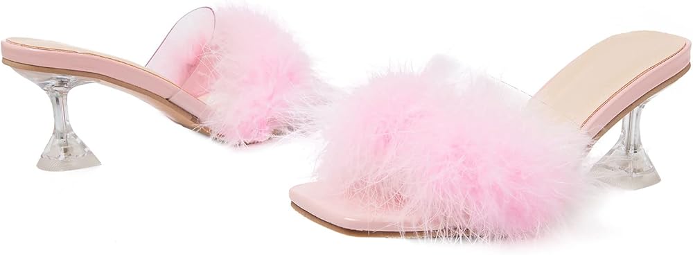 صنادل بكعب عالٍ: كعب مثلث مثير، ارتفاع مثالي للكعب يبدو مثيرًا ولكنه لا يزال مريحًا بالتأكيد للوقوف والمشي. جزء علوي شفاف من البولي يوريثين الحراري، صندل شفاف من الريش المنفوش مثير ولطيف، تضيف ألوان الحلوى نمطًا وتجعلك تبدين فريدة