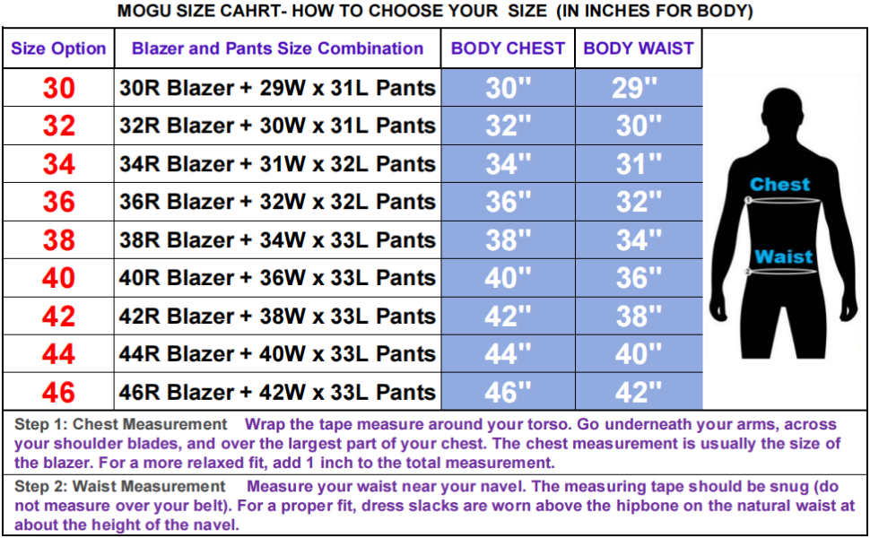 • مجموعة مقاسات السترة والسراويل المكونة من ثلاث قطع: مقاس 32 (جاكيت 32/بنطلون 30)؛ مقاس 34 (جاكيت 34/بنطلون 31)؛ مقاس 36 (جاكيت 36/بنطلون 32)؛ مقاس 38 (جاكيت 38/بنطلون 34)؛ مقاس 40 (جاكيت 40/بنطلون 36)؛ مقاس 42 (جاكيت 42/بنطال 38)؛ مقاس 44 (جاكيت 44/بنطلون 40)
