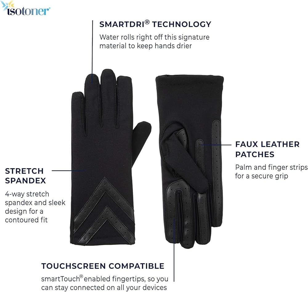 • STAY ACTIVE: isotoner's heritage 4-way stretch spandex provides a contoured yet flexible fit, while the palm strips provide improved grip, perfect for on-the-go lifestyles in winter or cold weather