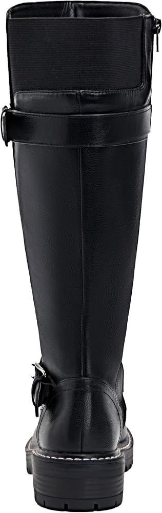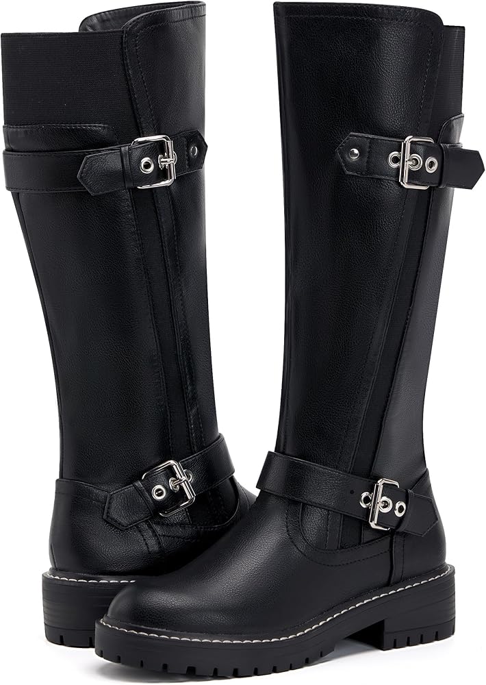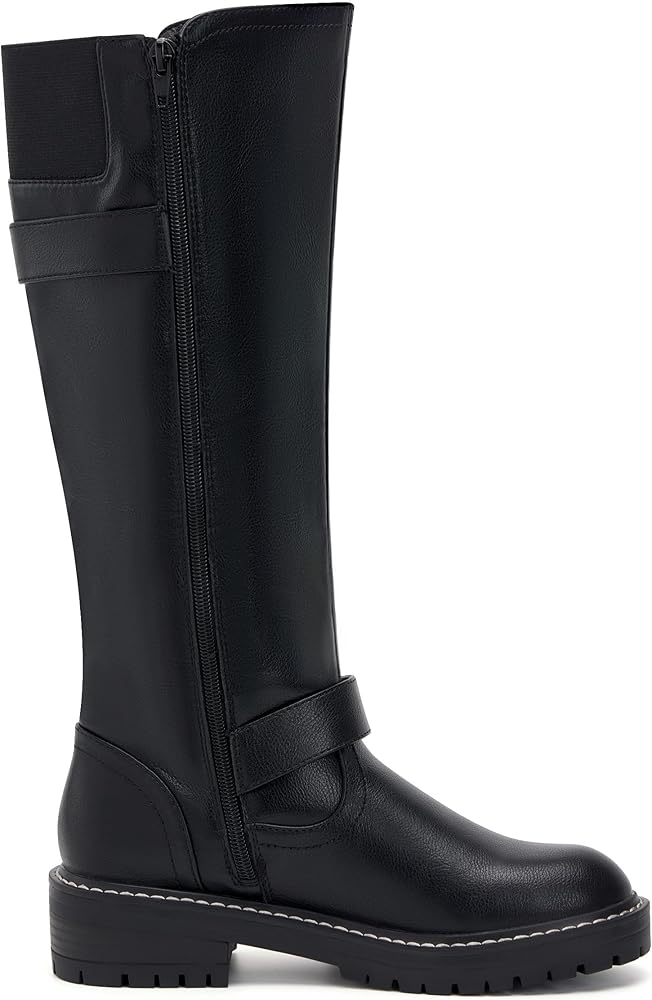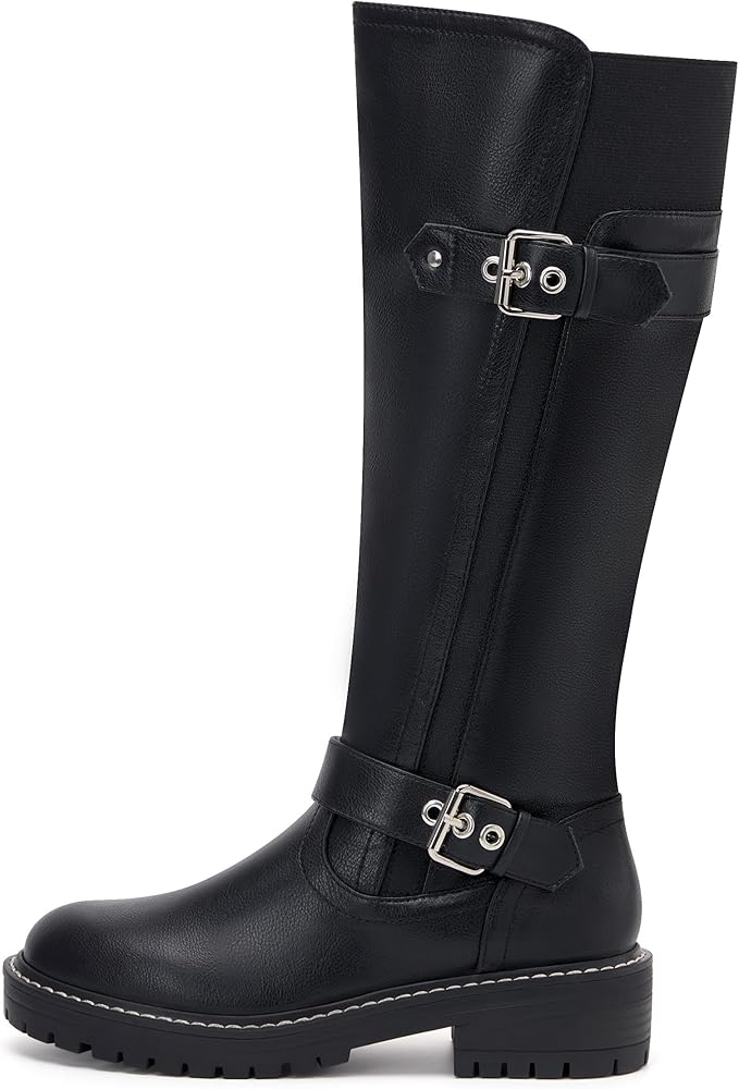 أضف لمسة جريئة وجريئة إلى ملابسك مع حذاء ركوب الدراجات النارية هذا الذي يصل إلى الركبة والذي يتميز بتصميم كلاسيكي بإبزيم.