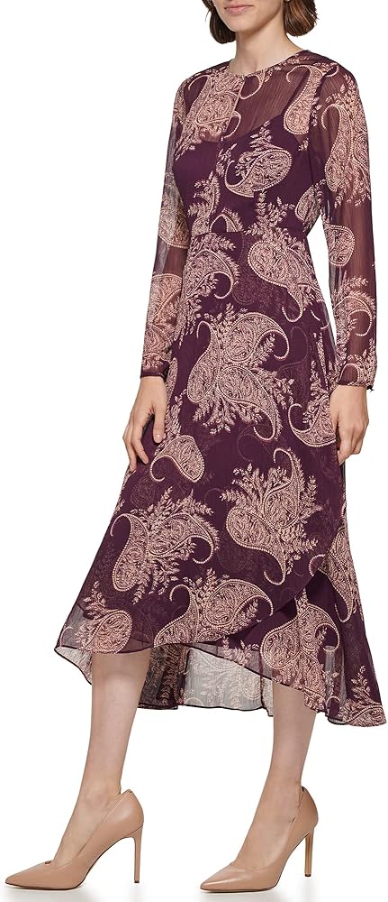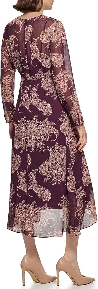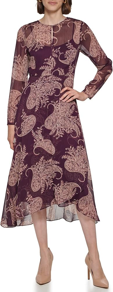 تومي هيليفيغر فستان متوسط الطول من الشيفون المطبوع مع حاشية شلال وربطة ذاتية عند الخصر. أربطة على الكم أيضًا.