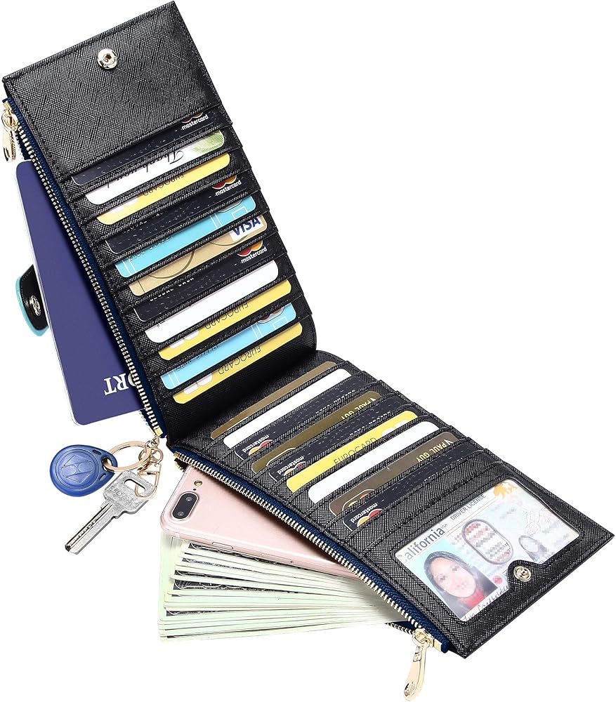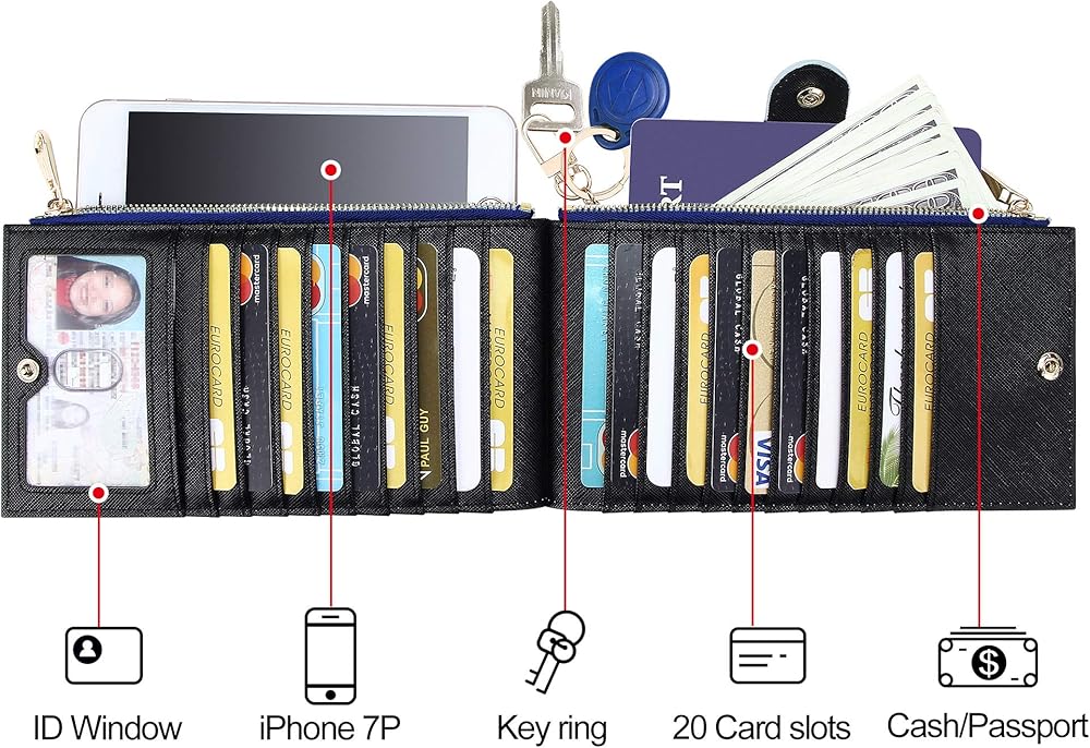 【سعة كبيرة وعملية】- 4.13 بوصة (طول) × 0.8 بوصة (عرض) × 3.22 بوصة (ارتفاع)، 17 فتحة للبطاقات، 1 نافذة شفافة لبطاقة الهوية، 1 سلسلة مفاتيح قابلة للإخفاء للمفاتيح، جيب مزدوج متين وقوي بسحاب، مشبك إنساني مزدوج لإبزيم التصميم، كل شيء يناسب تمامًا، يمكن أن يلبي ضرورياتك اليومية مثل iPhone XR/11 Max/11 Pro Max (أقل من 6.5 بوصة)، والأوراق النقدية، ودفتر الشيكات، والإيصالات، والتغيير، والنقود، وبطاقات الائتمان.
