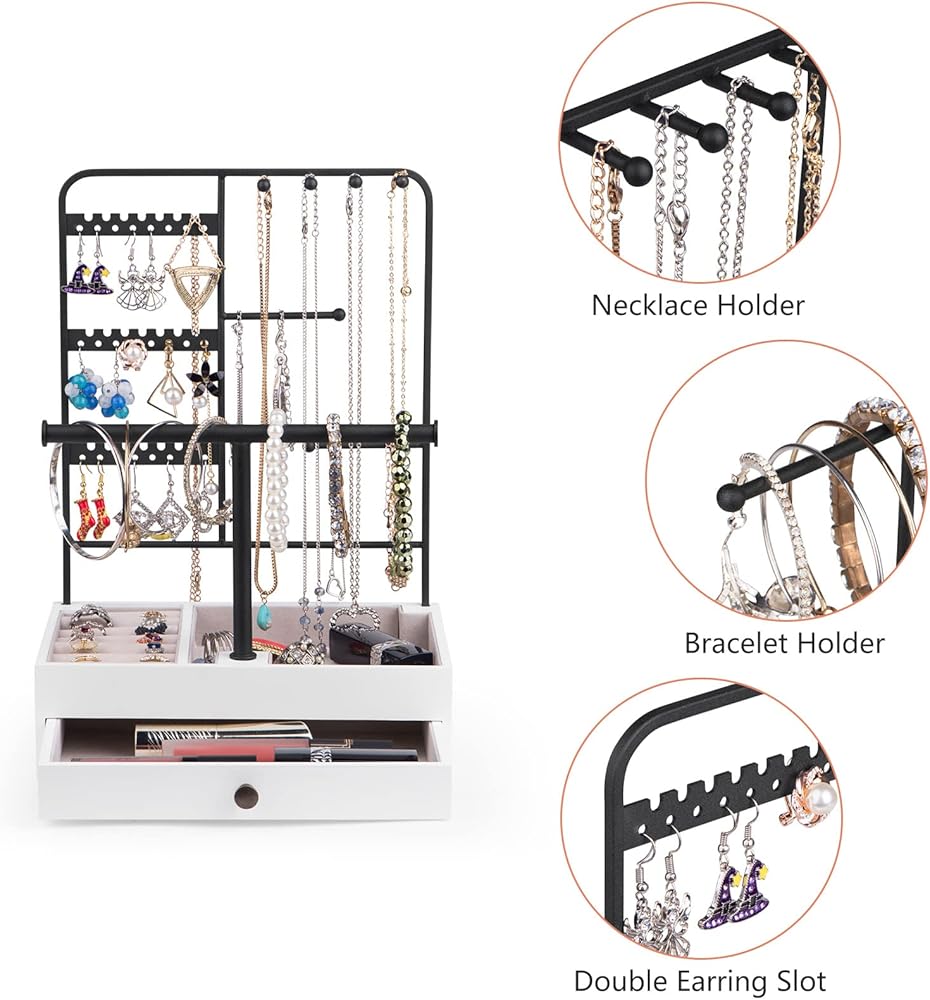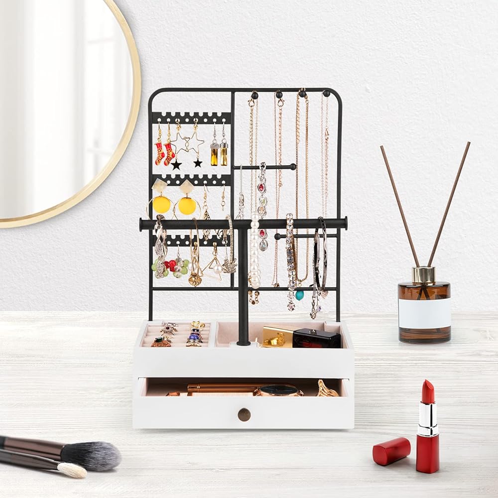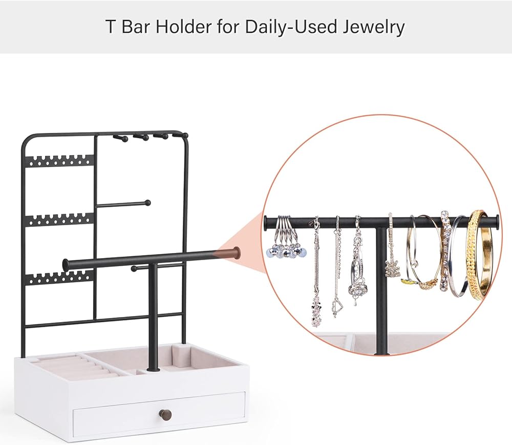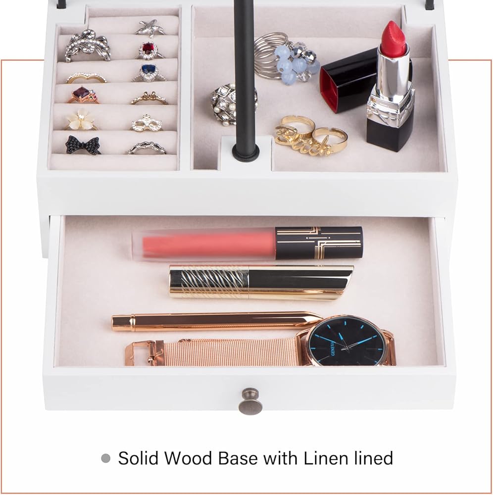 سعة كبيرة - منظم المجوهرات مجهز بمساحة تخزين مجوهرات خشبية كبيرة السعة مع درج وحاملين مجوهرات معدنيين. مساحة واسعة لعرض وتنظيم جميع القلائد والأساور والأقراط والخواتم مع الحفاظ عليها خالية من التشابك.
