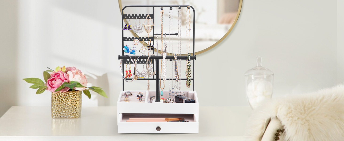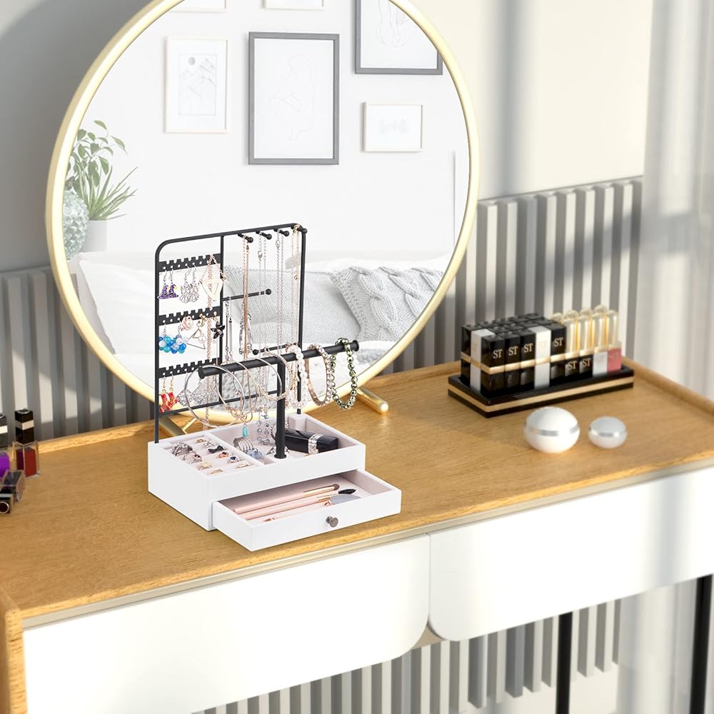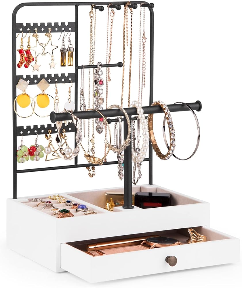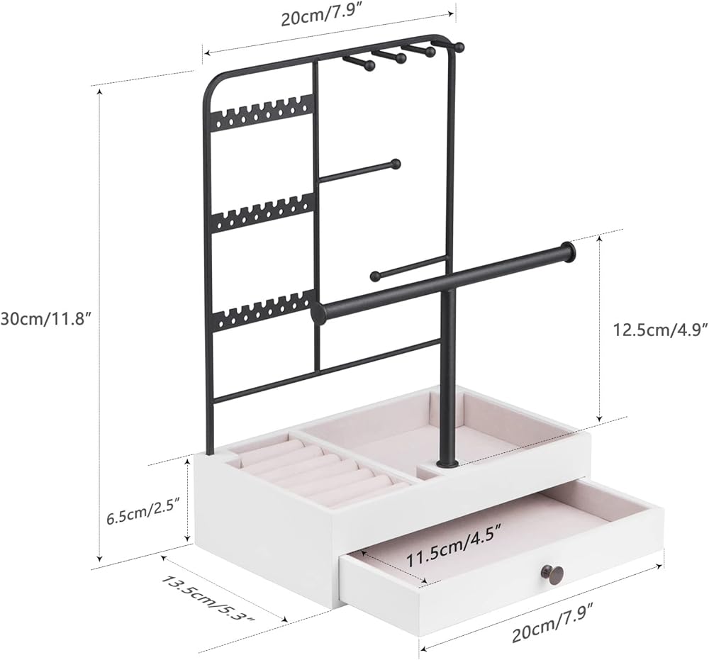 سعة كبيرة - منظم المجوهرات مجهز بمساحة تخزين مجوهرات خشبية كبيرة السعة مع درج وحاملين مجوهرات معدنيين. مساحة واسعة لعرض وتنظيم جميع القلائد والأساور والأقراط والخواتم مع الحفاظ عليها خالية من التشابك.