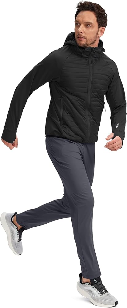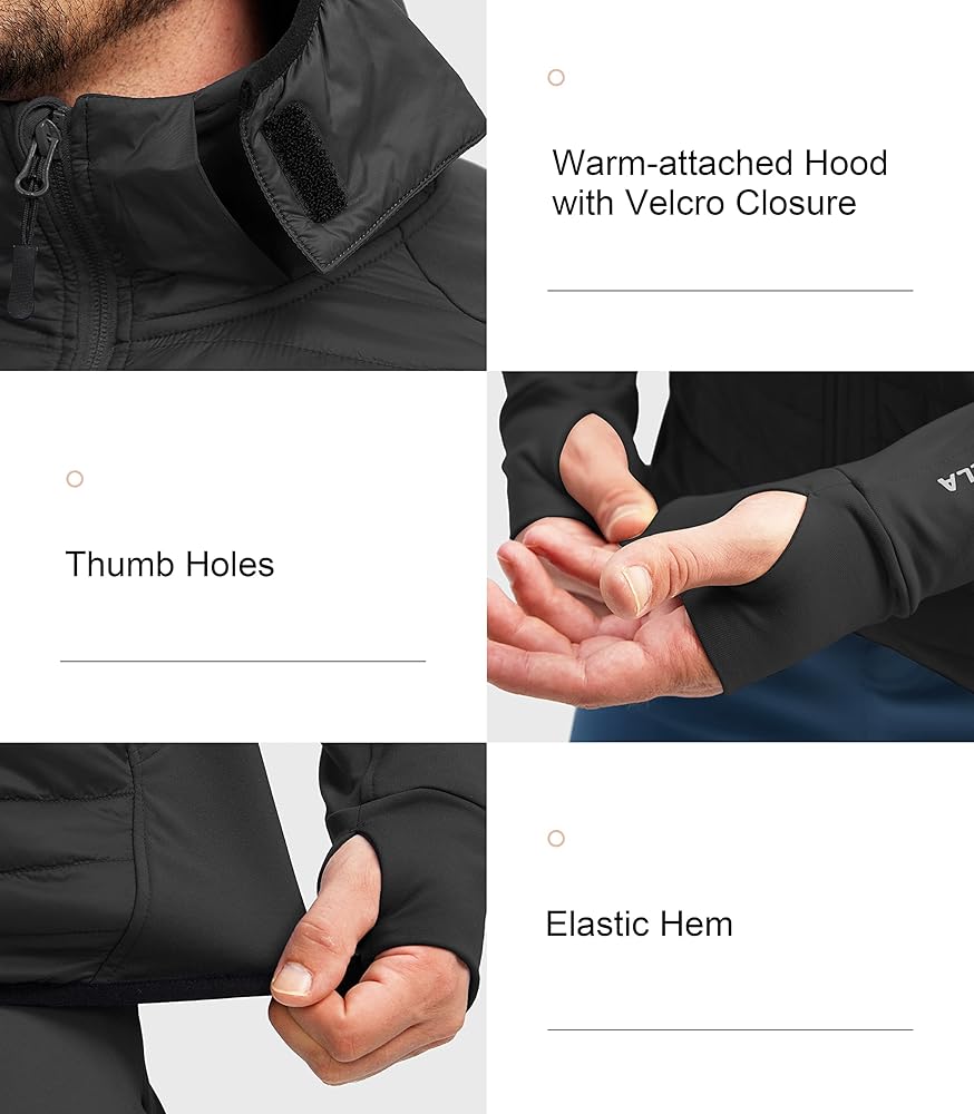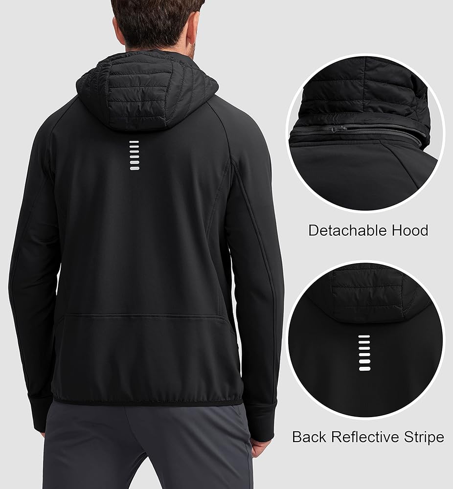 حاشية مرنة: سترة جري للرجال مع حاشية مرنة لملاءمة مخصصة، تمت إضافة فتحات الإبهام لزيادة تغطية اليد والدفء. يوفر الشريط الخلفي العاكس رؤية أفضل أثناء الجري في ظروف الإضاءة المنخفضة.