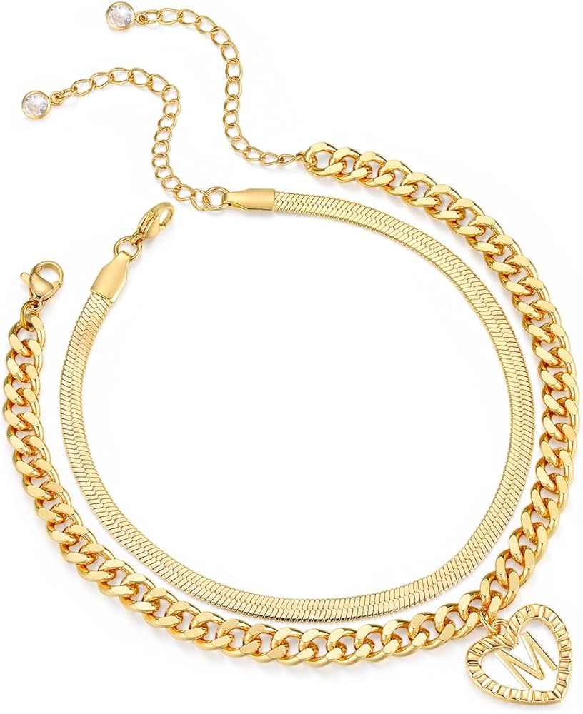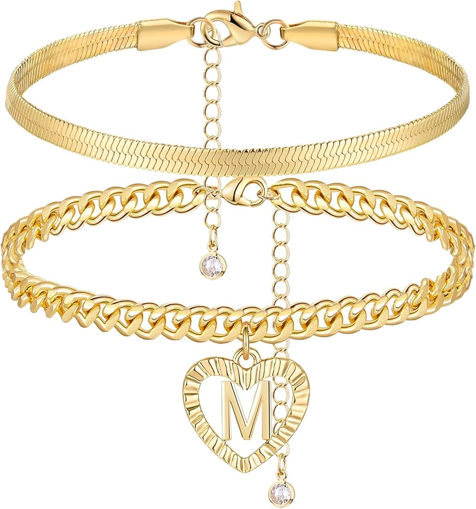 أساور الكاحل الأولية للنساء: قطعتان من سلاسل الثعبان المطلية بالذهب عيار 14 قيراط والخلاخيل الكوبي بأحرف قلب أنيقة. لا غنى عنه للصيف والشاطئ وركوب الأمواج والمواعدة والارتداء!