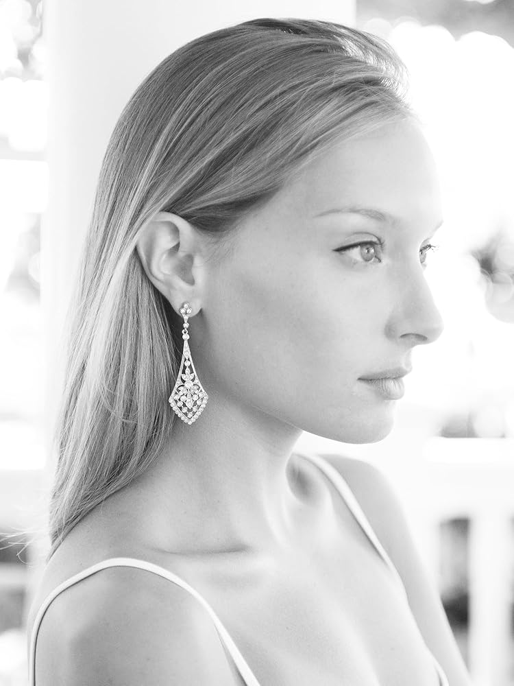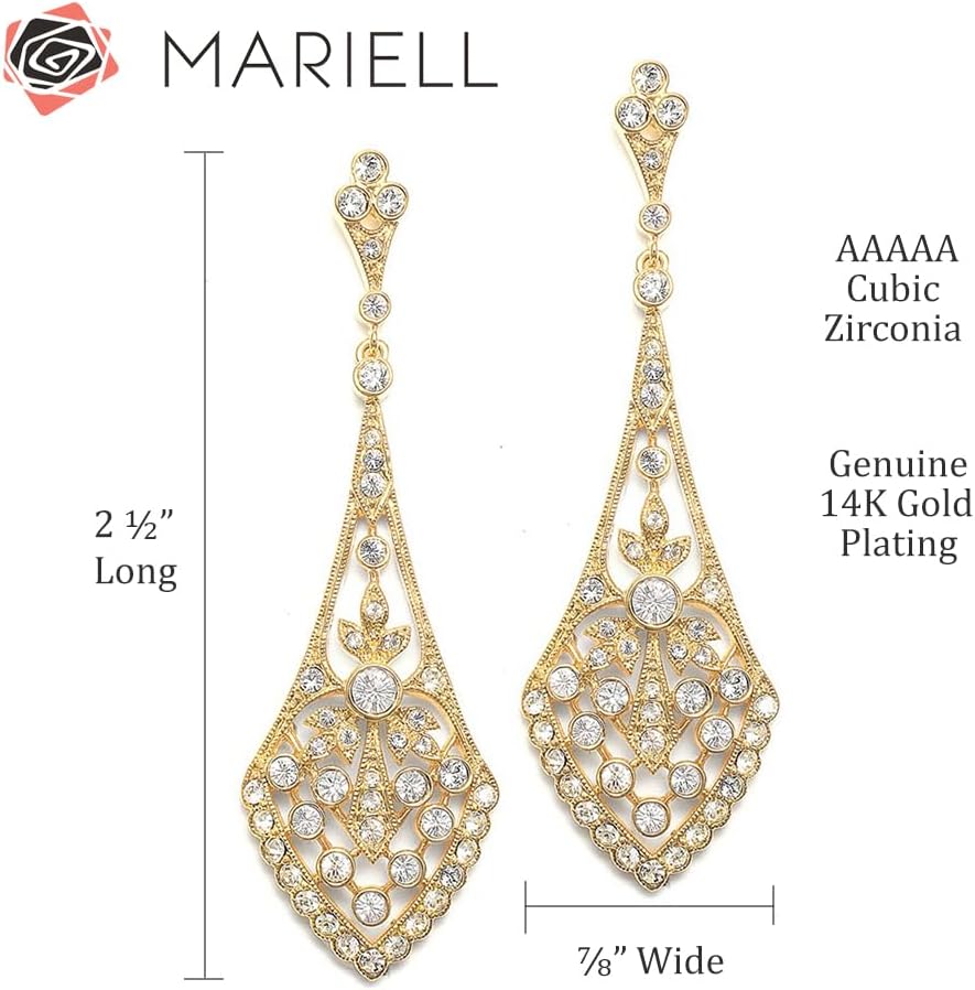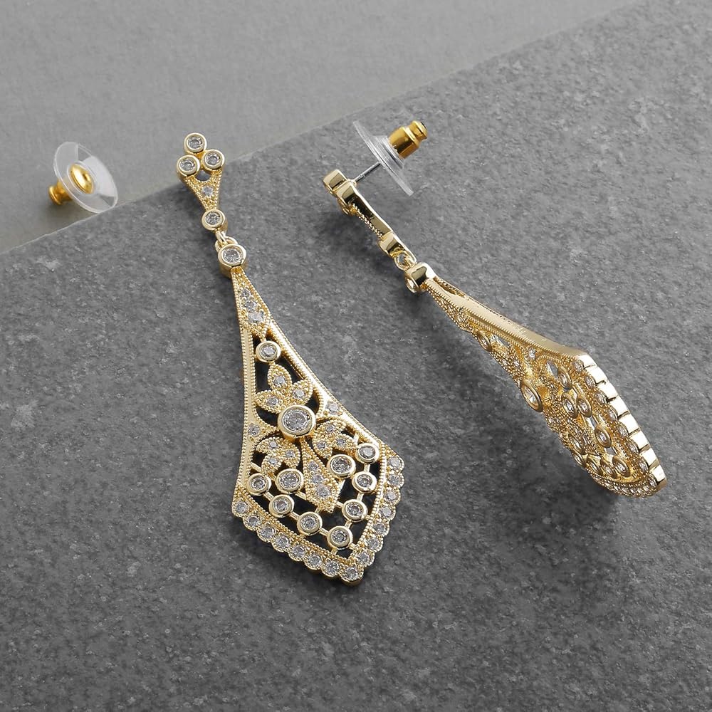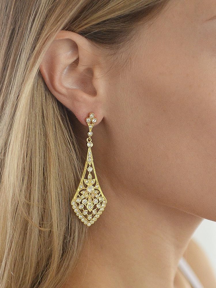ستضفي أقراط الزفاف الدرامية على طراز آرت ديكو من ماريل تصميمًا عتيقًا ساحرًا لحفل زفافك أو مناسبة خاصة. لقد وقعنا تمامًا في حب الأناقة الخالدة لهذه الثريات الكلاسيكية المصنوعة من الذهب الوردي والمستوحاة من عشرينيات القرن العشرين. بفضل تصميمها الأنيق المتوهج، تتألق هذه الأقراط الثريا العتيقة مع زركونيا مكعبة عالية الجودة والروديوم الفضي الأصلي، وطلاء الذهب عيار 14 قيراط أو الذهب الوردي. يتمتع هؤلاء الأكثر مبيعًا بمظهر لا لبس فيه من مجوهرات الإرث التي لا تقدر بثمن وبسعر منخفض رائع. اصنع مدخلاً كبيرًا لا يُنسى في جمال ماريل العتيق المرصع بالجواهر بقياس 2 3/4 بوصة ارتفاع. بعد اليوم الكبير، ارتدي هذه المتدليات متعددة الاستخدامات لقضاء ليلة في المدينة أو عشاء رومانسي على ضوء الشموع. ستصبح هذه القطع المذهلة إضافة ثمينة إلى منزلك مجموعة المجوهرات دلل نفسك أو أي شخص تحبه ببعض التألق الرائع على الطراز القديم.
