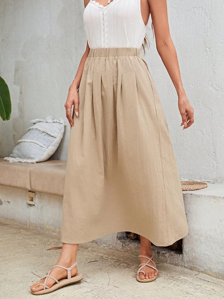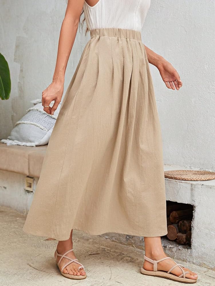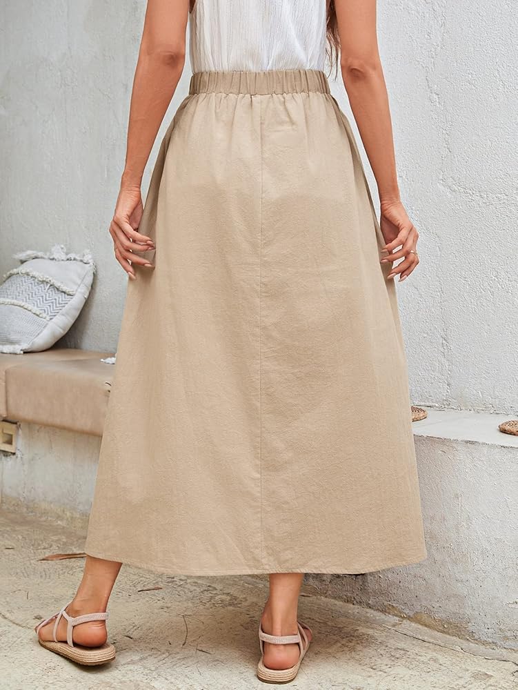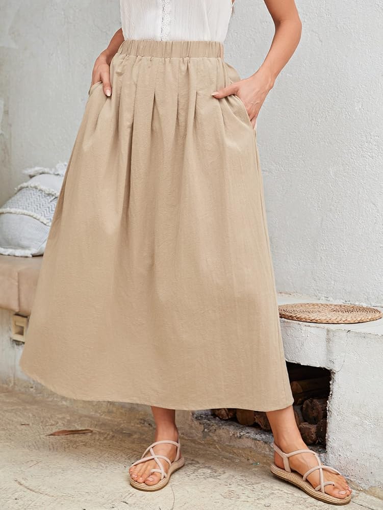 - خصر عالي، جيب مائل، خط، سادة، تنورة طويلة كاجوال