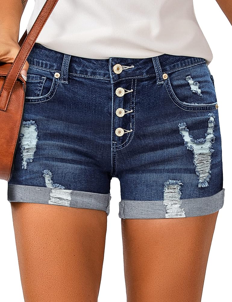 • شورت جينز ممزق بأزرار سفلية مصمم بشعيرات مزعجة وبهتان. من السهل ارتداء بلوزة عادية مع هذا الجينز القصير عالي الارتفاع للحصول على مظهر مريح.