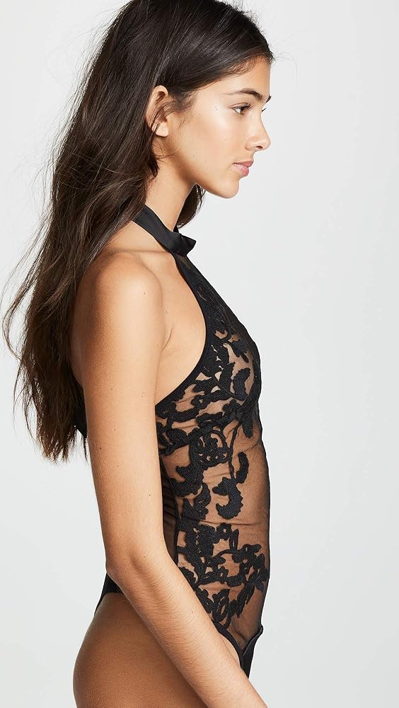 تم تصميم هذا البدلة الشبكية الشفافة من Thistle & Spire مع أربطة هالتر حريرية ومزينة بلمسات من الدانتيل الجبر الرومانسي.