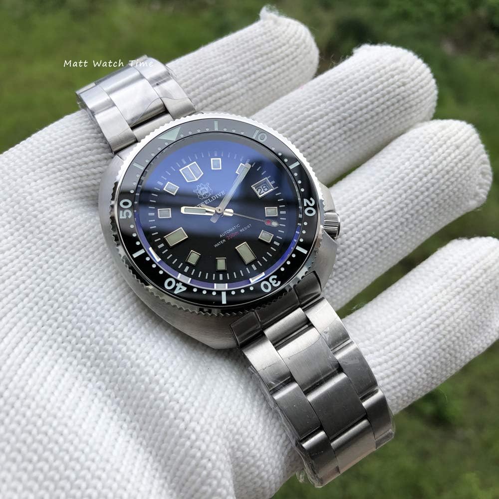 Up for is a brand new Steeldive SD1970 Diver. By Authorized Retailer. Inspired by 6115-8110 model famously worn by Martin Sheen's character, Captain Willard, in the Vietnam war movie Apocalypse Now NH35 Automatic Movement Hacking and Handwinding Sapphire Crystal with Blue Anti-Reflective Coating 120 Click Rotational Ceramic Bezel BGW9 / C3 Luminova Dial and Ceramic Bezel Insert Black Dial and Bezel Insert color 44mm Case Diameter 47mm Lug to Lug 13.5mm Case Thickness Screwdown Crown Screwback Case 316L Stainless Steel Case Stainless Steel Bracelet Hard Presentation Box and Please also see YouTube reviews to know this watch and Steeldive. All watches with full package available in Adelaide SA. Items are well protected with Australia Post Standard Box. Ships within 1-2 business days from Australia.Enjoy this watch for your collection. Regards, Matt BurnsideChrono