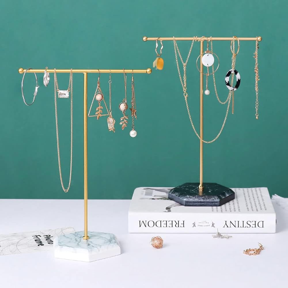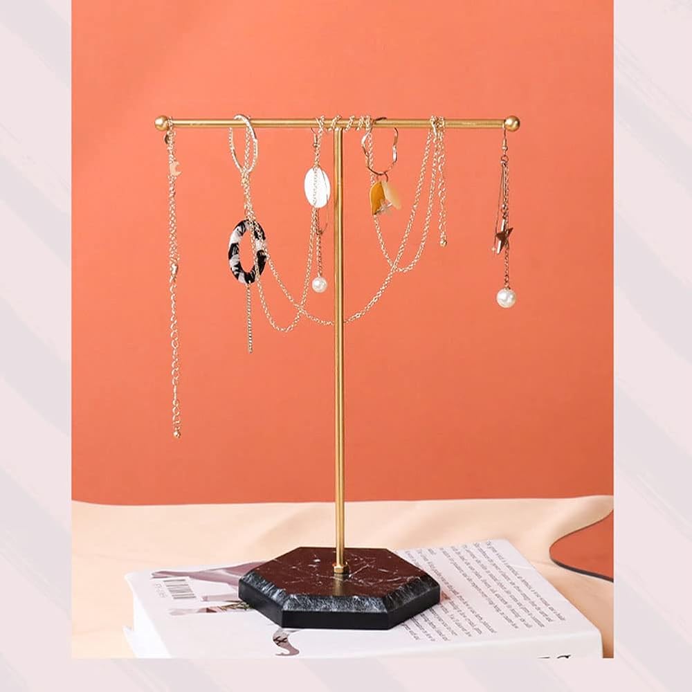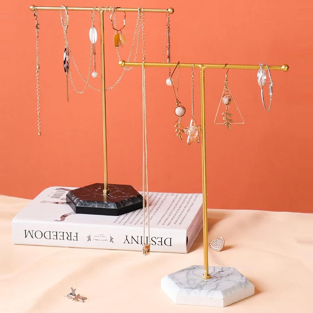 • 【حامل مجوهرات مزخرف】مصنوع من قواعد خشبية من الخشب الرقائقي مع لمسة نهائية من الرخام (وليس حجر الرخام) وتصميم قضيب معدني، ويتميز بمظهر أنيق؛ مثالية لتنظيم المجوهرات أو العرض الاحترافي في متاجر البيع بالتجزئة أو العروض التجارية.