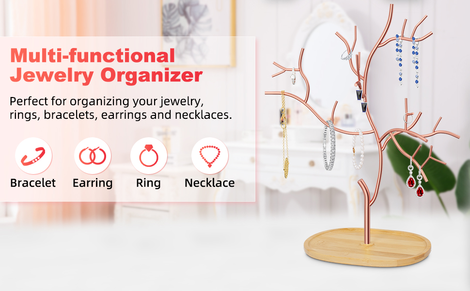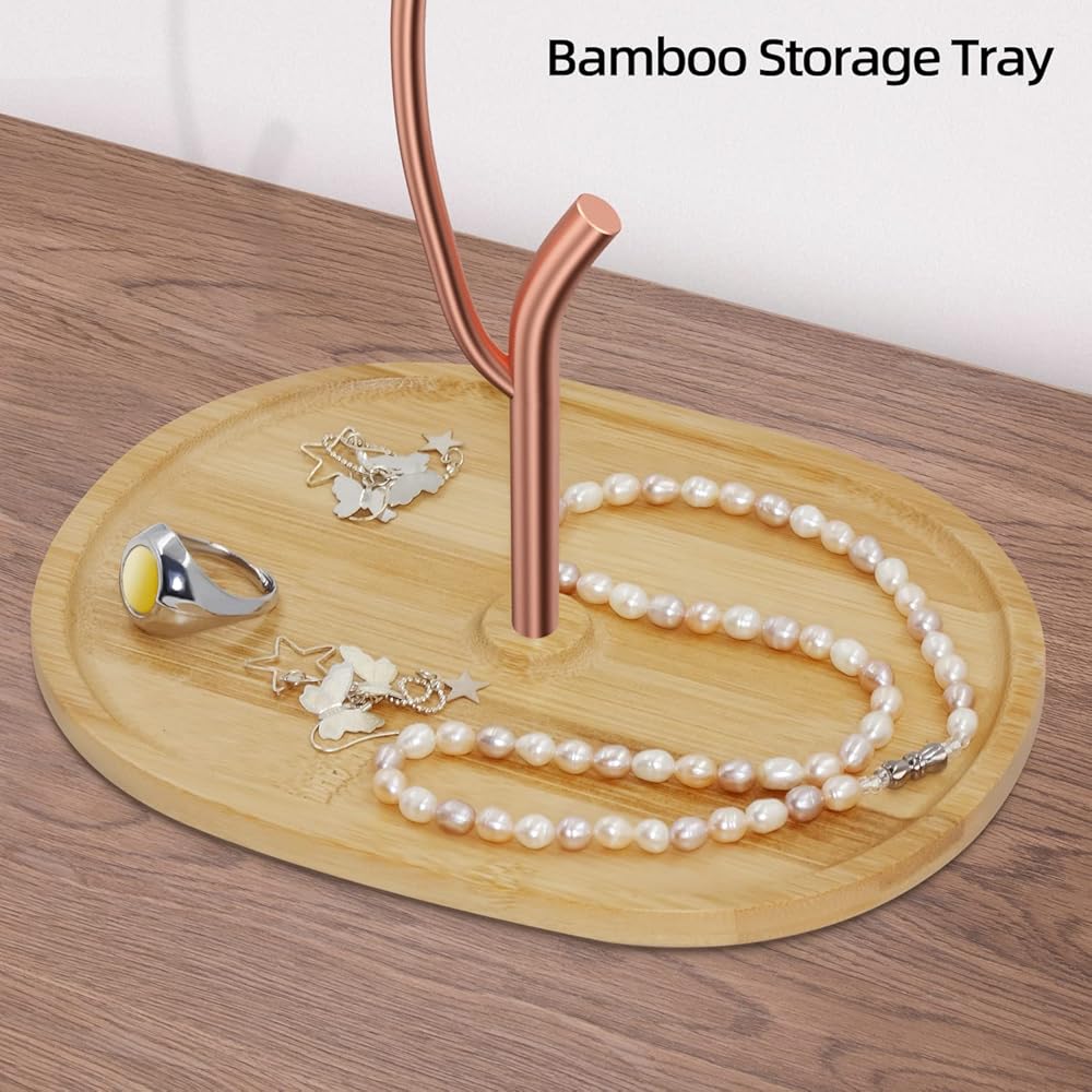 موفر للمساحة - مع أكثر من 6 فروع من شجرة المجوهرات وصينية الخيزران ذات السعة الكبيرة، يمكنها تنظيف سطح المكتب الفوضوي الخاص بك، وتبقيك بعيدًا عن مشكلة عقد المجوهرات. جميع المجوهرات منظمة بشكل جيد ويمكن الوصول إليها بسهولة.