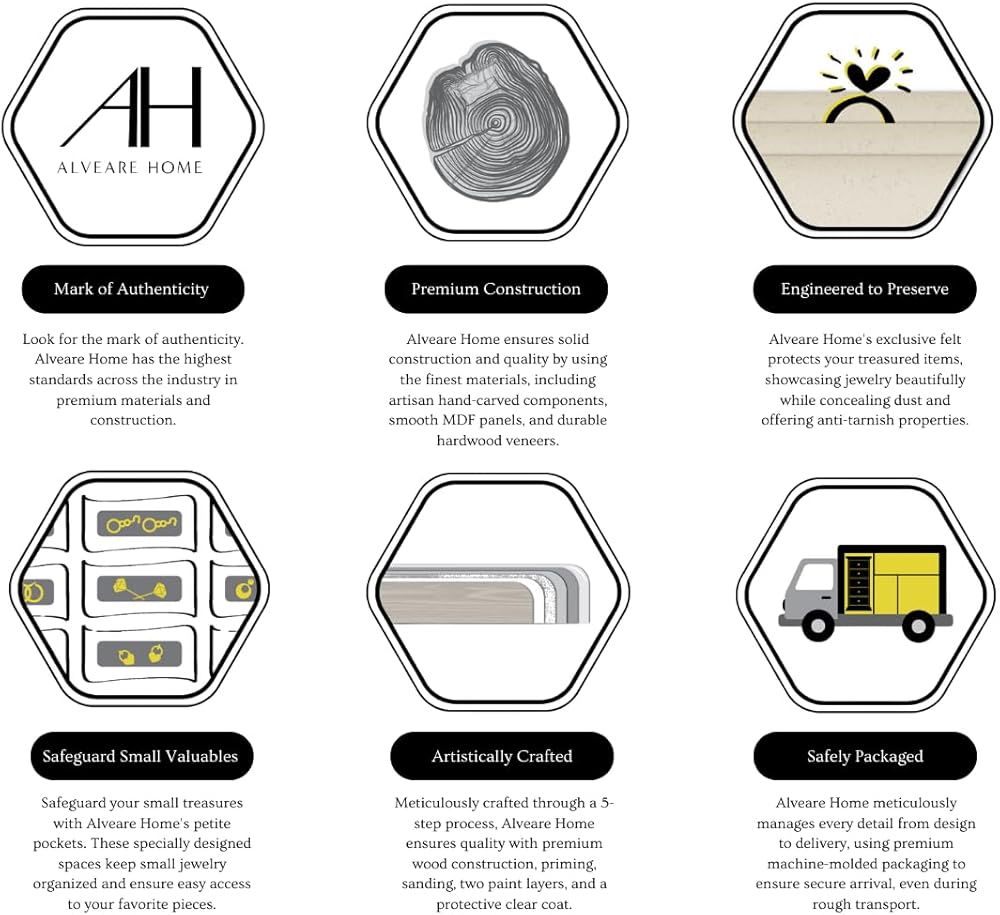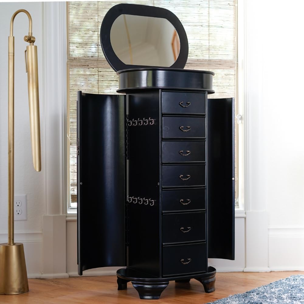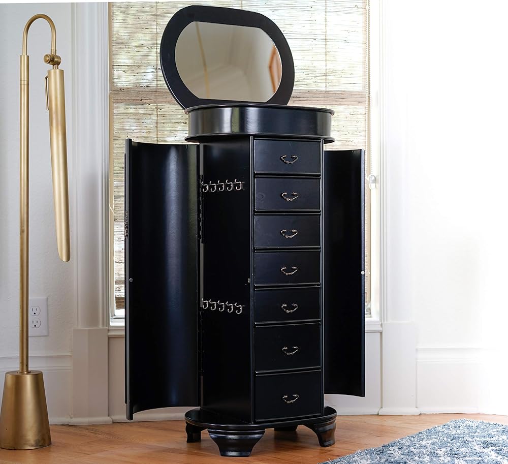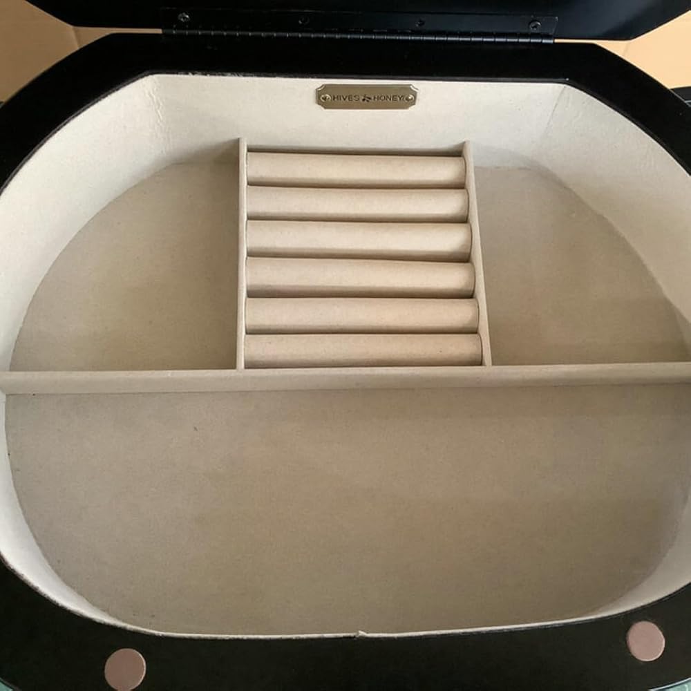 يفتح الغطاء المفصلي على مرآة مستحضرات الزينة ولفائف الحلقات ومساحات التخزين المقسمة