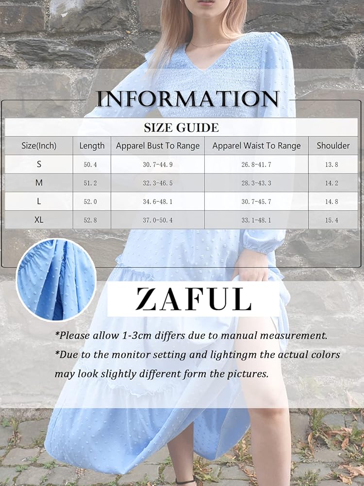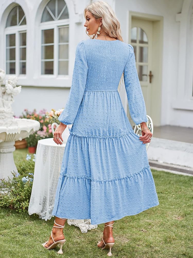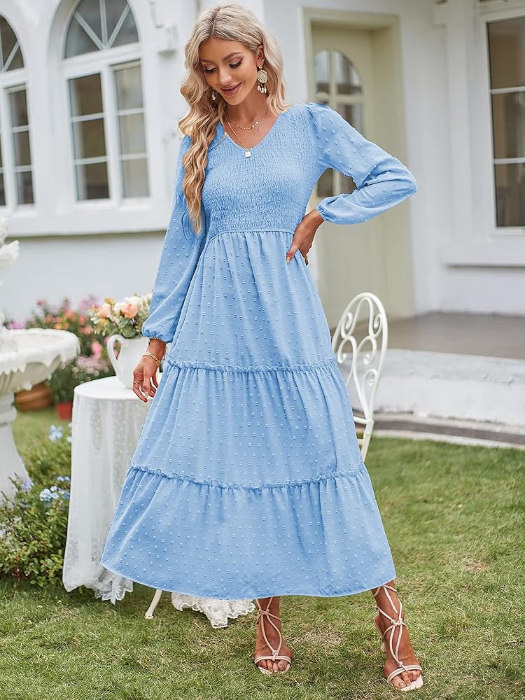 فستان طويل فريد من نوعه: فستان طويل بطبقات للسيدات يأتي مع رقبة على شكل حرف V وجيوب، وأكمام طويلة، وصدر وخصر مكشكش، وخصر مرتفع، وحاشية فضفاضة مكشكشة. مع قماش الشيفون البوهيمي المتأرجح ذو النقاط السويسرية، يمكن أن تكمل فساتين الخريف الطويلة هذه قطعك في جميع المواسم.