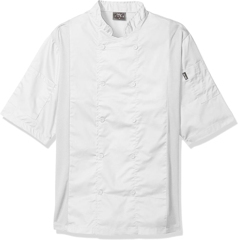 شيف كود معطف شيف بفتحات تهوية جانبية من كول بريز مع بطانة شبكية على كل جانب. مقدمة مزدوجة الصدر مع أزرار مغطاة بالقماش وجيوب على الأكمام وهيكل متين. نسيج قطني ناعم للأطفال بوزن 5 اونصة، قطن/بوليستر.