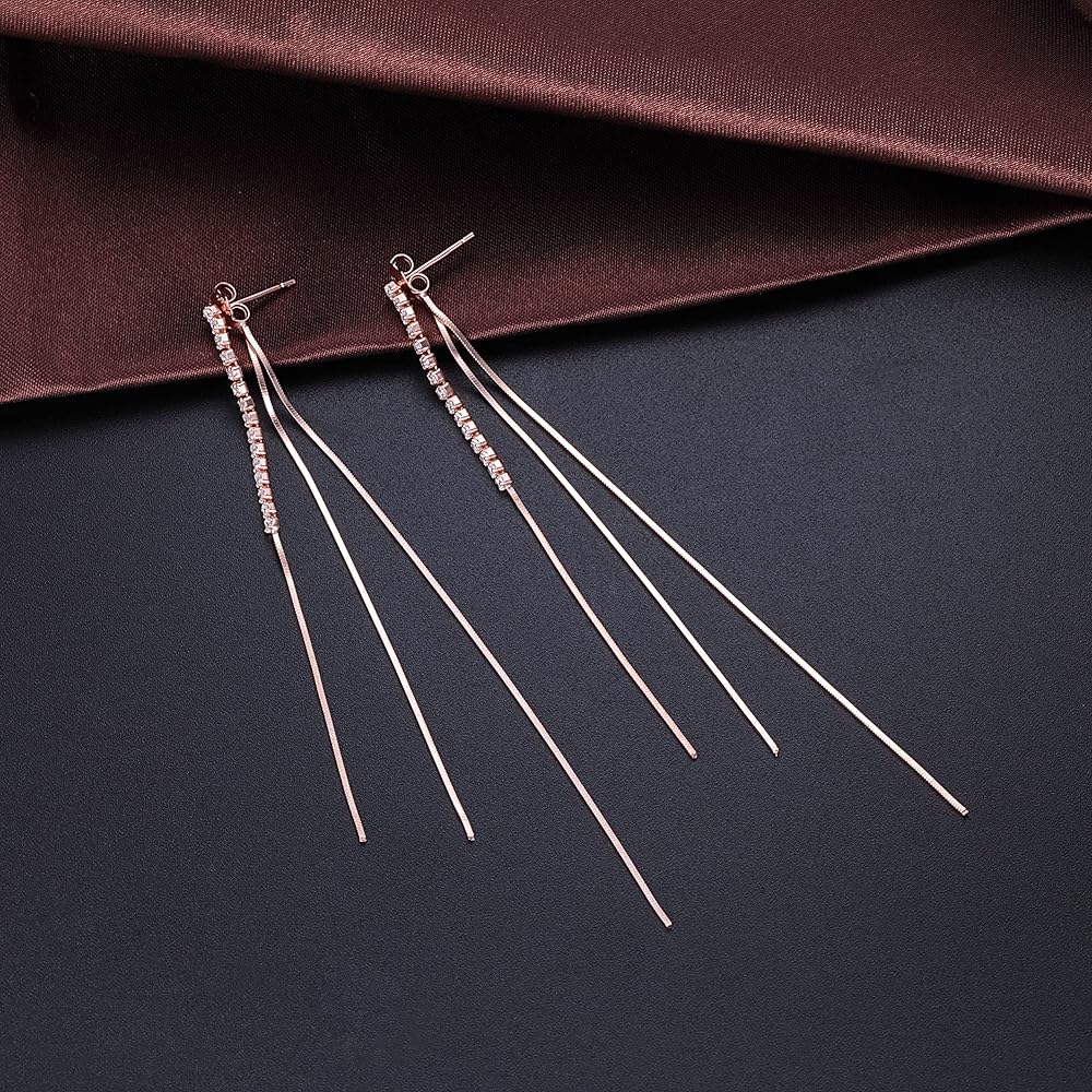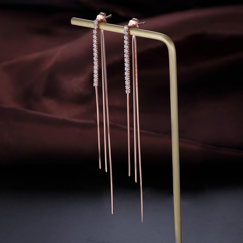 مواصفات المنتج: طول سلسلة cz الأمامية 7 سم (2.75 بوصة)، طول سلسلة الثعبان الخلفية 9.3 سم (3.7 بوصة)، وزن الأقراط بأكملها 2.65 جرام/زوج، هذه الأقراط الأنيقة جميعها تأتي بقطعة قماش فضية نظيفة بشكل جميل علبة هدية مختومة SLUYNZ.
