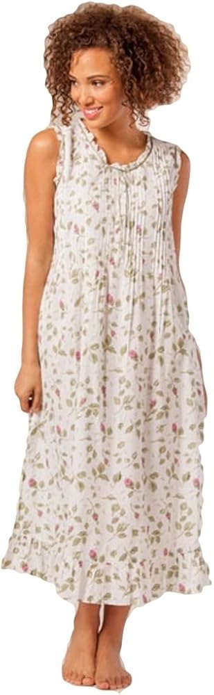 'Soft & Easy'' sleeveless nightgown in a mint rosebud print on white cotton lawn. This 100% pure cotton nightgown has lovely feminine details and gentle gathering for a flattering drape. This ''Soft & Easy'' cotton nightgown is perfect for relaxed dreamy nights and tranquil mornings. Size recommendations based on test fit are: Small (6-8), Medium (10-12), Large (14-16), X-Large (18-20).