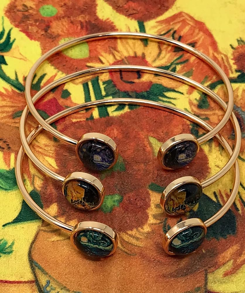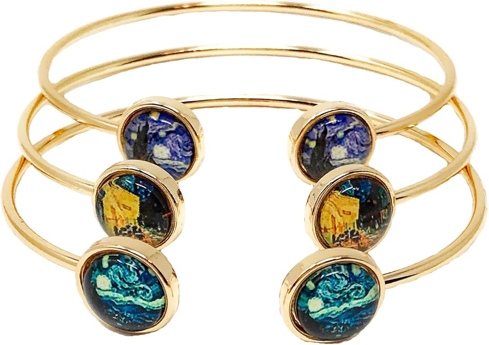 - ** فان جوغ ** أساور حلقية فنية بثلاثة أسلاك فنية بتصميم ليلة مليئة بالنجوم باللون الأزرق الأرجواني، ليلة مليئة بالنجوم باللون الأزرق الفاتح وشرفة كافيه في الليل