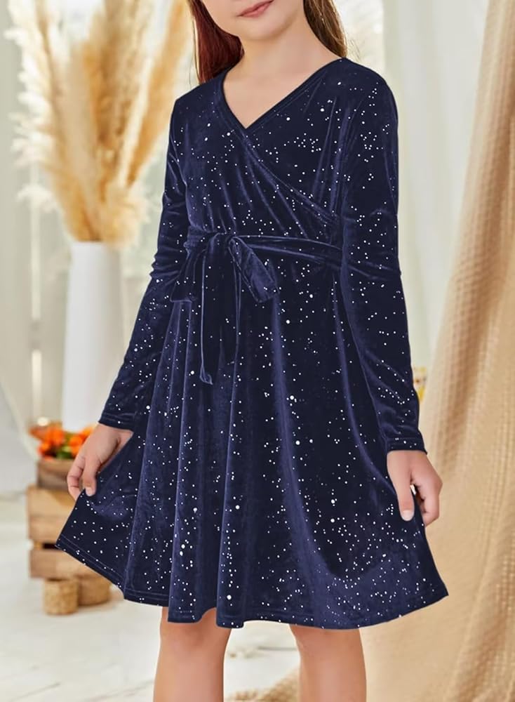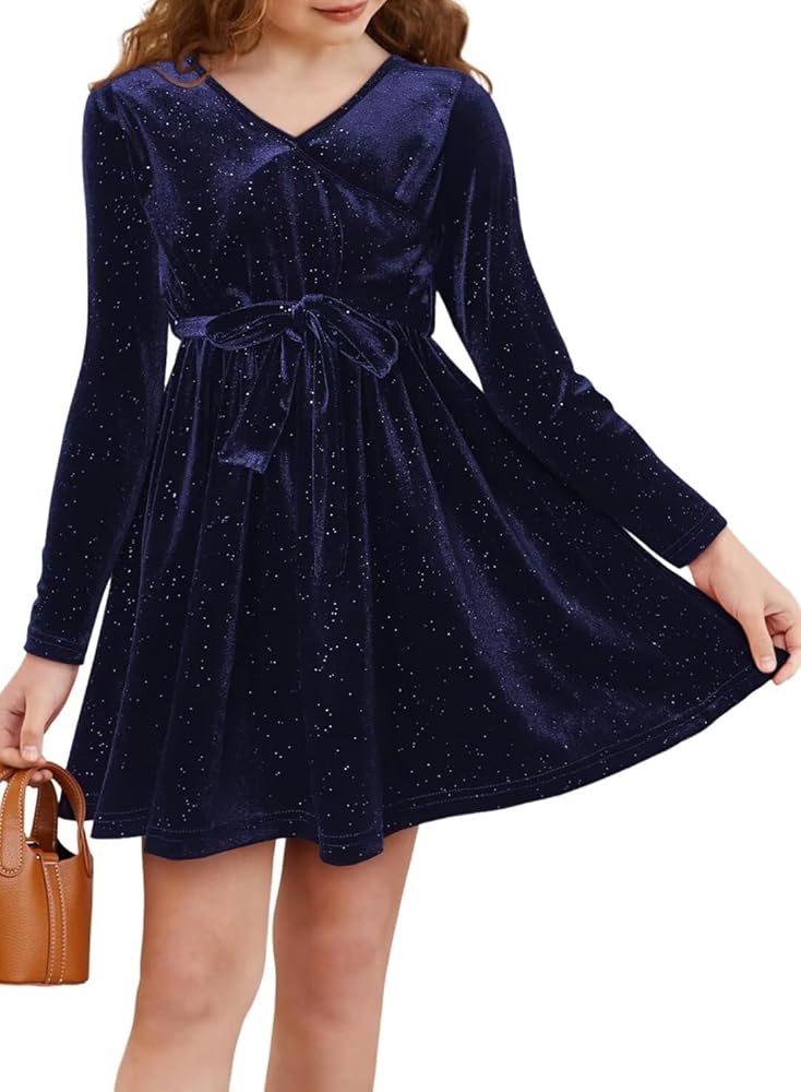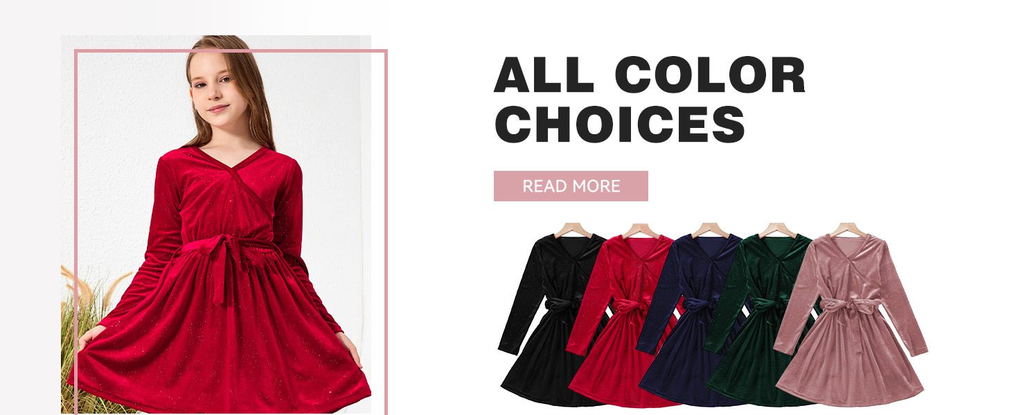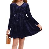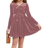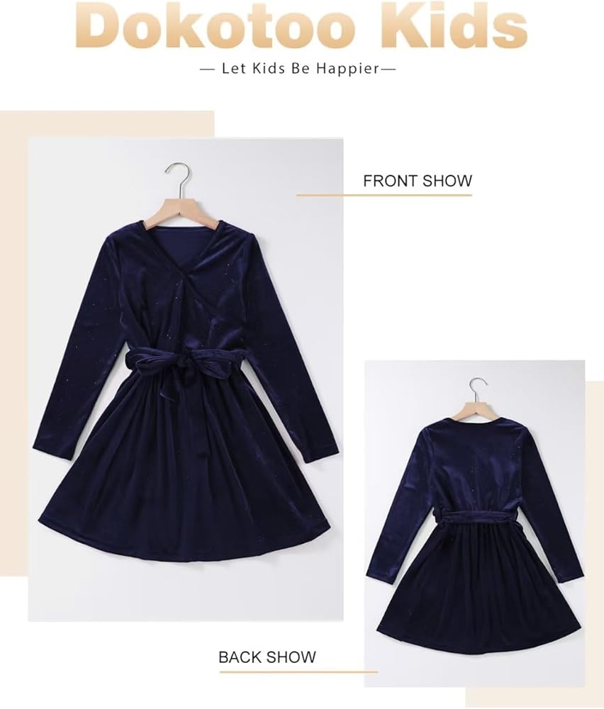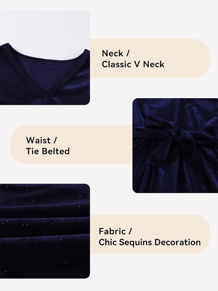 الميزات: فساتين بناتي مخملية، عصرية وأنيقة. يتميز بألوان كلاسيكية ثابتة، وأكمام طويلة، ورقبة على شكل حرف V ملفوفة، وزخرفة من الترتر، وحزام ربط وتصميم على شكل حرف A، مما يخلق مظهرًا أنيقًا وفريدًا دون عناء.