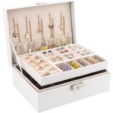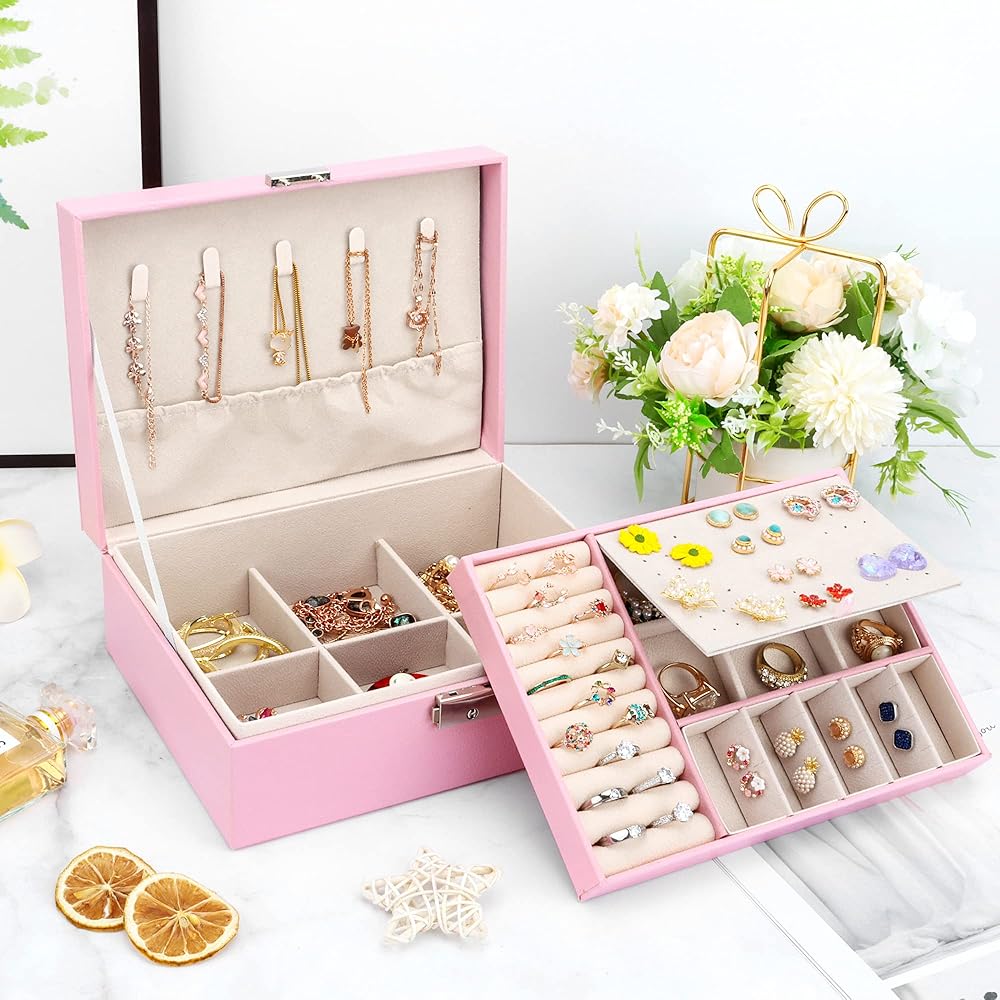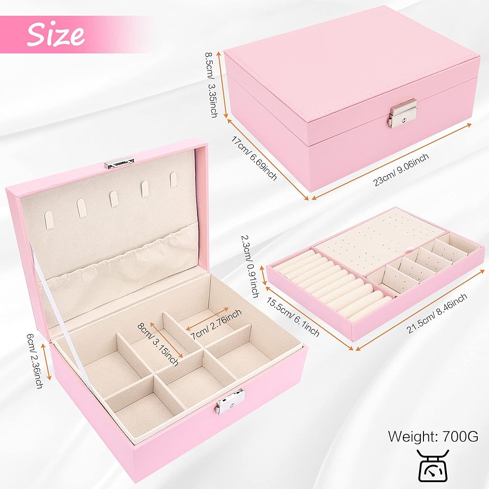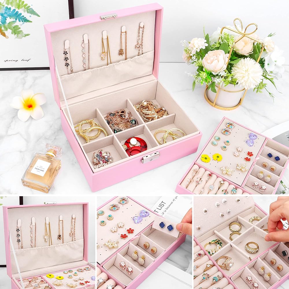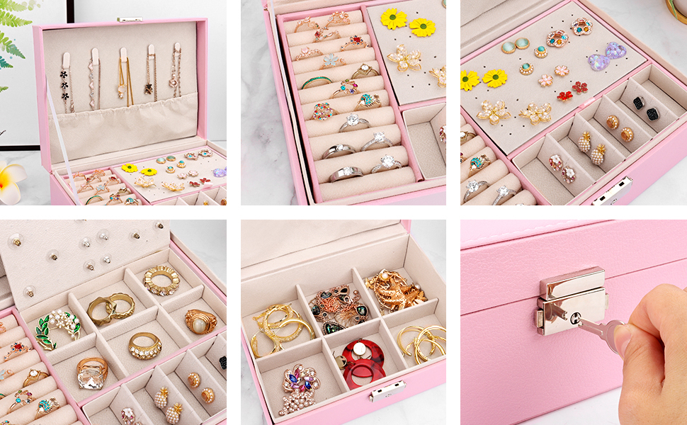 • 💕 طبقتين بسعة كبيرة - تصميم قابل للتكديس مع مجموعة متنوعة من المقصورات المرنة يجعل من السهل تنظيم جميع أنواع المجوهرات، بما في ذلك الأقراط والأساور والخواتم والقلائد والساعات وما إلى ذلك. مع حقيبة تخزين المجوهرات الخاصة بنا، ستتوفر جميع مجوهراتك تكون منظمة وسهلة الوصول إليها.