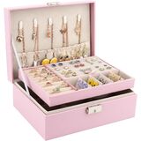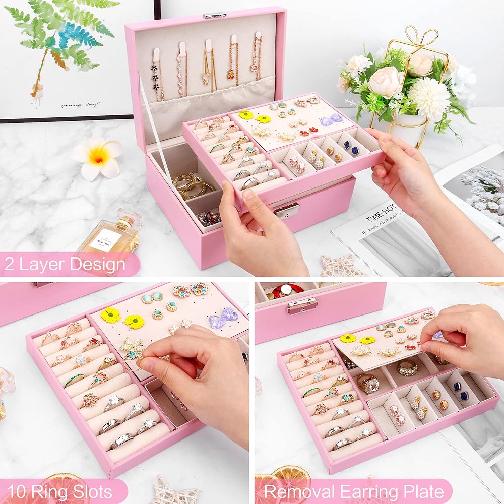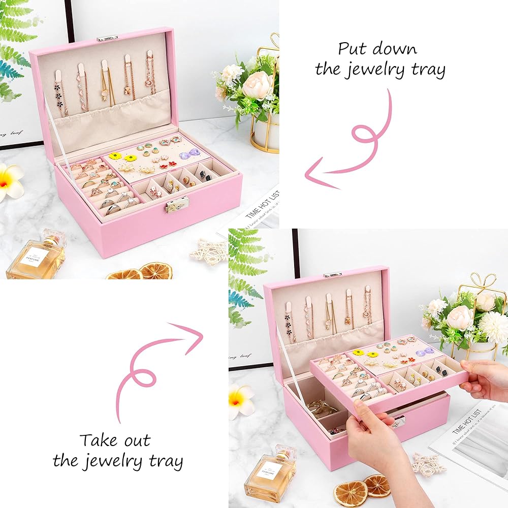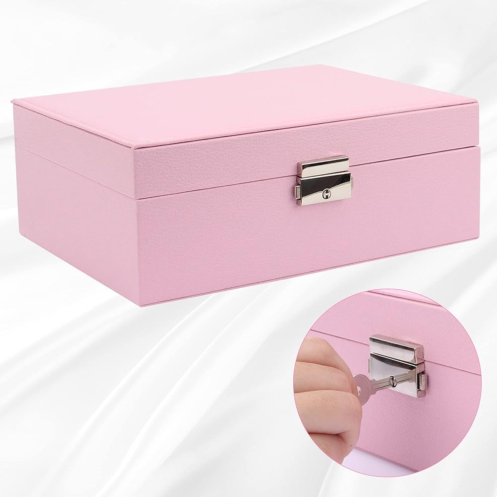 منظم صندوق المجوهرات من ديزاينستر مع قفل من طبقتين من جلد البولي يوريثان، حقيبة تخزين المجوهرات مع صينية قابلة للإزالة للقلادة والأقراط والخواتم والأساور (وردي)