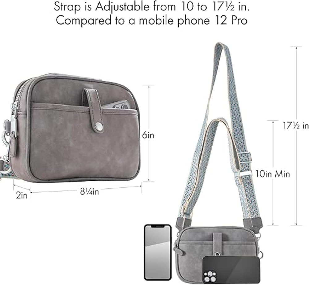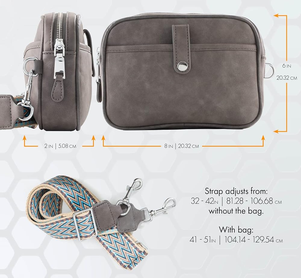 المقاس: الطول 17.78 سم، والطول 12.7 سم مع فتحة جيب بسحاب 1.5 سم (17.78 سم طول × 12.7 سم ارتفاع × 3.81 سم عرض). ستحمل بسهولة المحفظة والمفاتيح والهاتف وجواز السفر والمزيد.