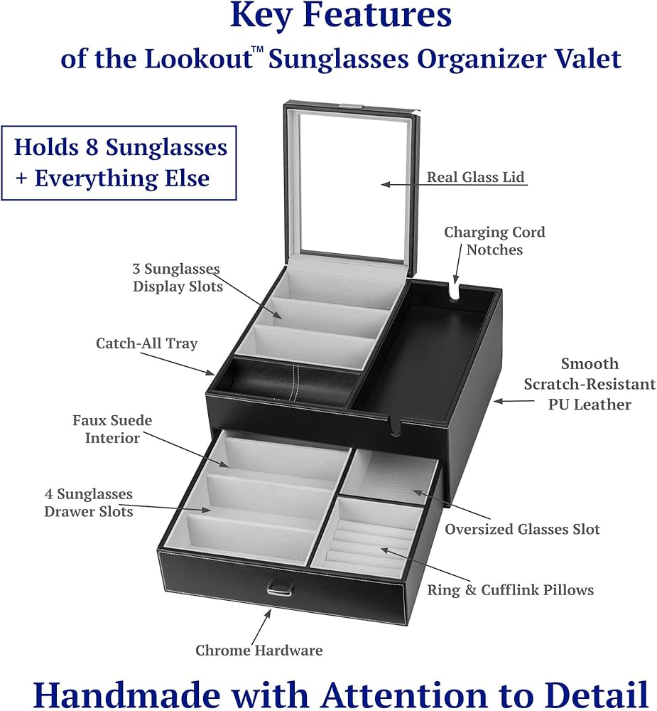 هدية جاهزة - تأتي في صندوق هدايا ثقيل الوزن مع شعار لامع يضيف حقًا إلى عامل "رائع" عند استلامه كهدية. يترك The Lookout انطباعًا خطيرًا للغاية على أي شخص محظوظ بما فيه الكفاية للحصول على منظم تخزين النظارات الشمسية وصندوق منظم منضدة الليل كهدية.