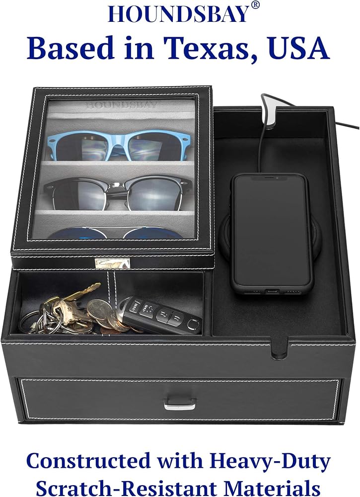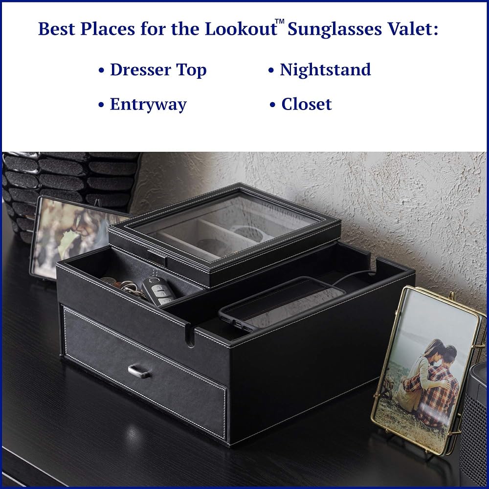 يجمع صندوق Lookout Valet بين منظم خزانة الملابس وشاشة عرض النظارات الشمسية - في انتظار الحصول على براءة اختراع من HOUNDSBAY، يجمع صندوق منظم علبة النظارات الشمسية الكبير هذا بين محطة شحن كبيرة الحجم وصينية التقاط ودرج الملحقات والعلبة وفتحات تخزين النظارات الشمسية أو النظارات تحت شاشة زجاجية حقيقية. جفن العين.