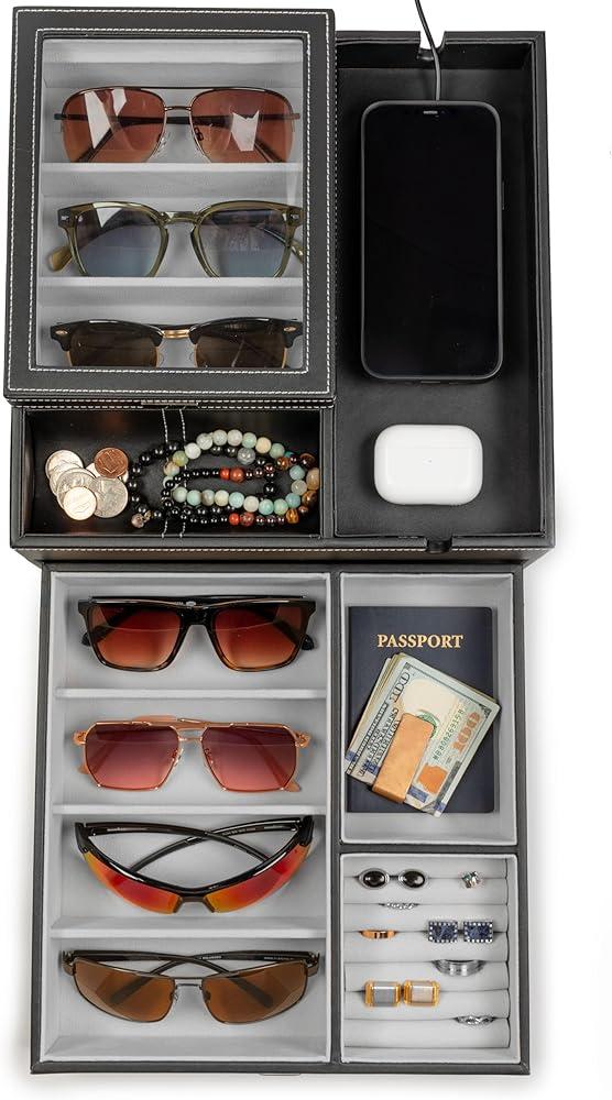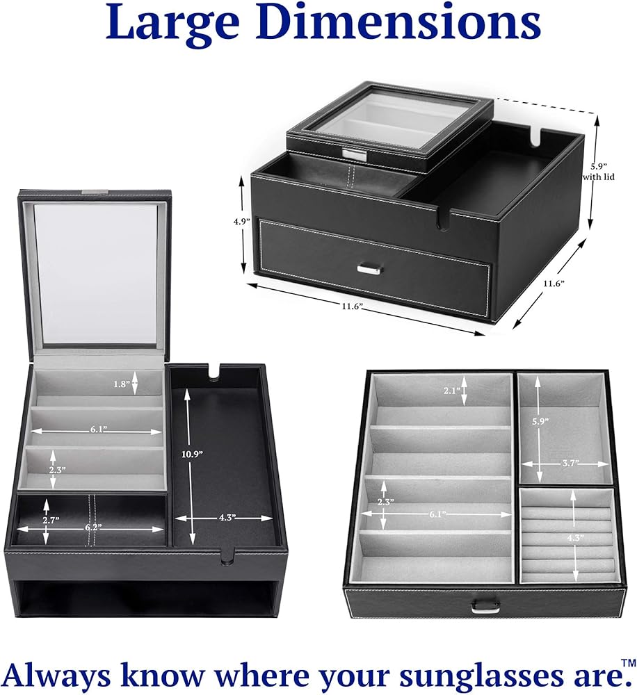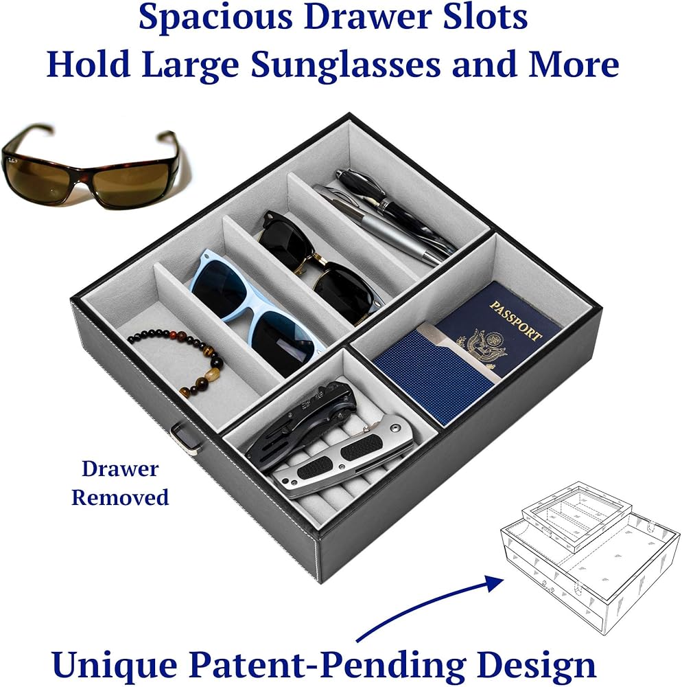 أقسام الدرج العميقة والواسعة تحمل المزيد من النظارات الشمسية، وتوفر مساحة كبيرة لتخزين EDC الأخرى مثل المصابيح الكهربائية والمحافظ والأقلام والخواتم وأزرار الأكمام وما إلى ذلك. يحتوي الدرج على قسم خاص للخواتم وأزرار الأكمام والمجوهرات الصغيرة. أبعاد المراقبة الإجمالية هي 11.7 بوصة عرض × 11.7 بوصة عمق × 6.0 بوصة ارتفاع.