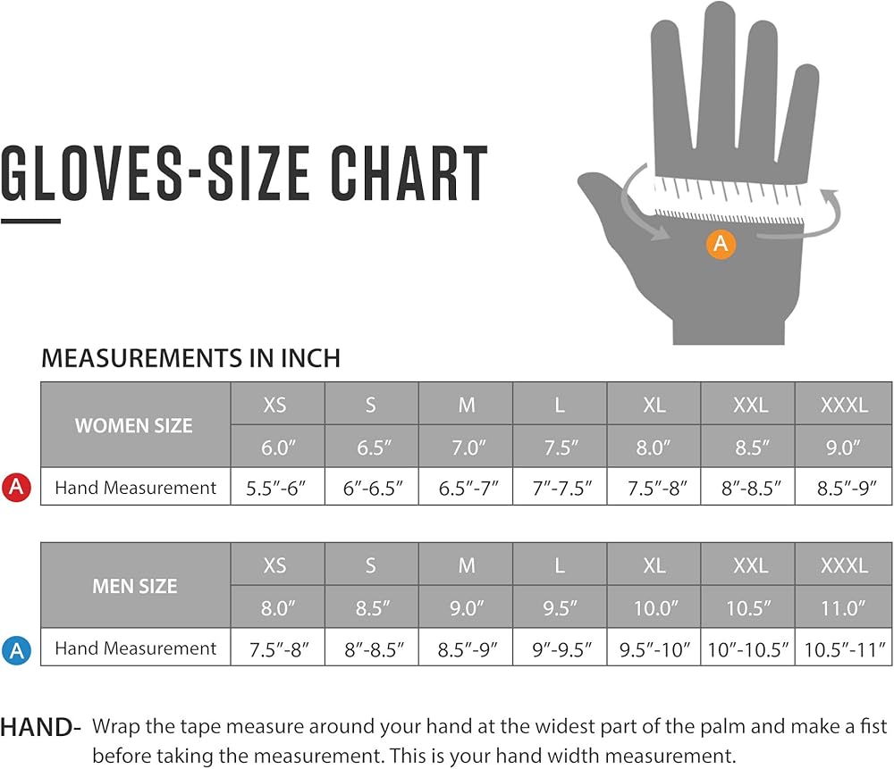 • مجموعة كاملة من مقاسات القفاز - لتحديد مقاسك، يمكنك قياسها بشكل أساسي حول يدك التي تهيمنها، باستثناء إبهامك. المقاس بالبوصة هو مقاس قفازك. إذا قمت بالقياس بالسنتيمترات، يجب عليك تقسيم المقاس بمقدار 2.54 لتحديد مقاس القفاز. *(نحن مقاسات الولايات المتحدة القياسية، والتي تناسب يدك بإحكام. ولكن إذا كنت تبحث عن مقاس أكثر راحة، يرجى اختيار مقاس واحد.)