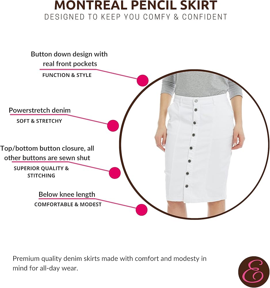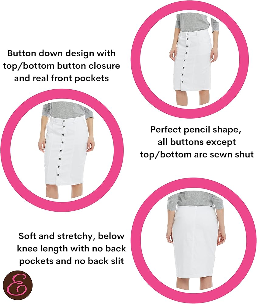 - المواصفات، طول التنورة: المقاسات 0-10: 24 بوصة، المقاسات 12 - 14: 24.5 بوصة. المقاسات 16 - 18 : 25 بوصة