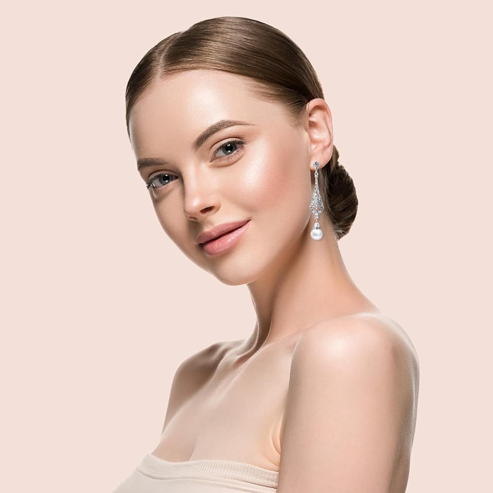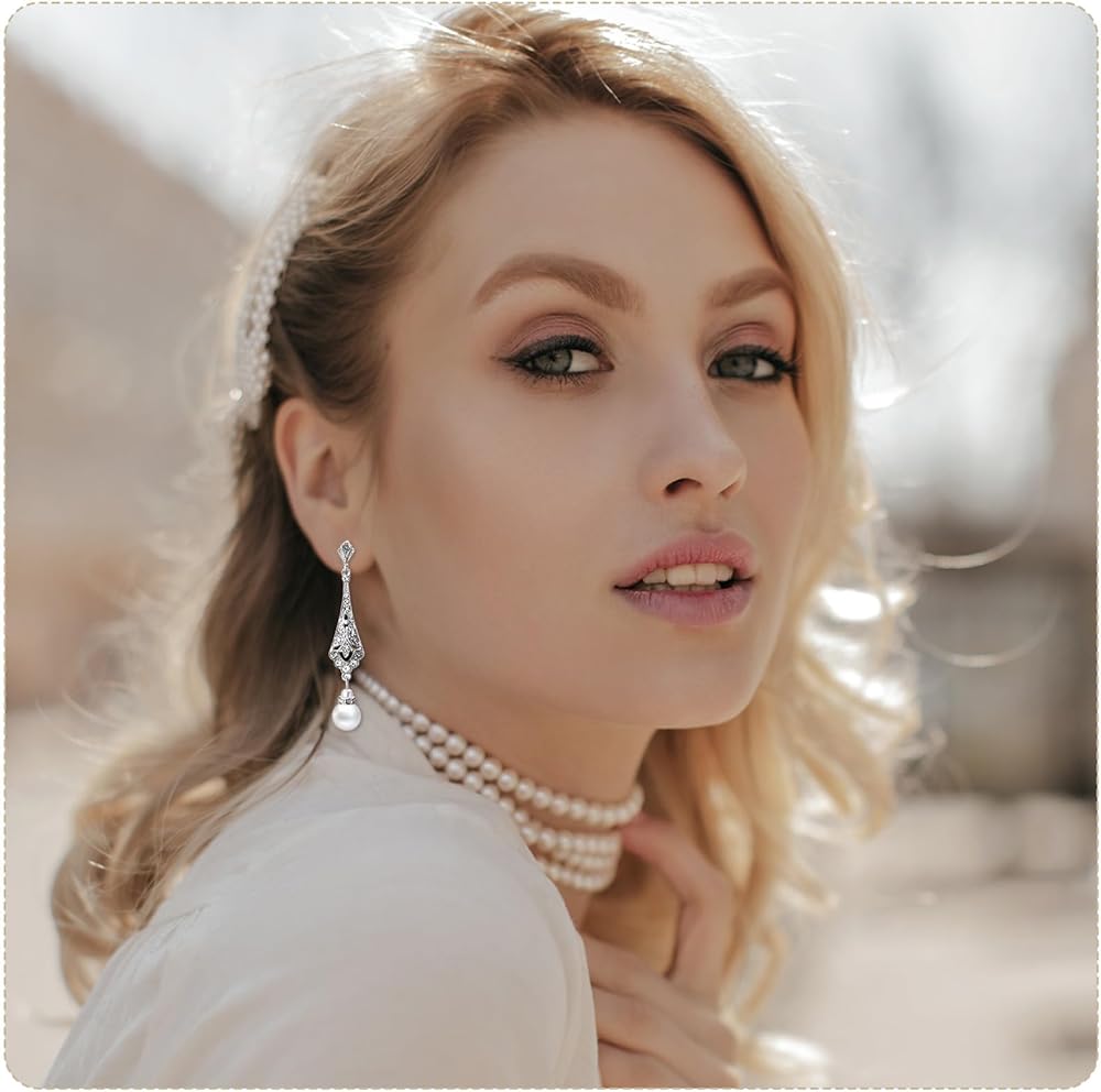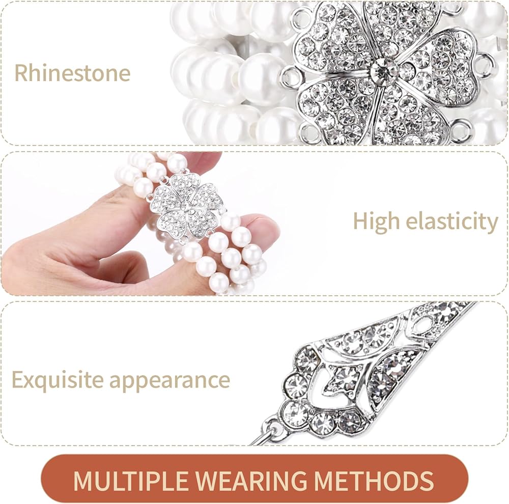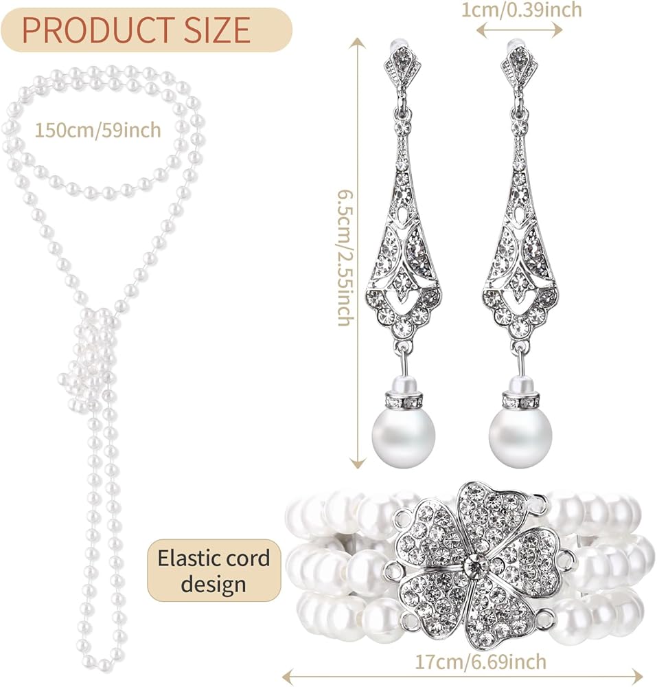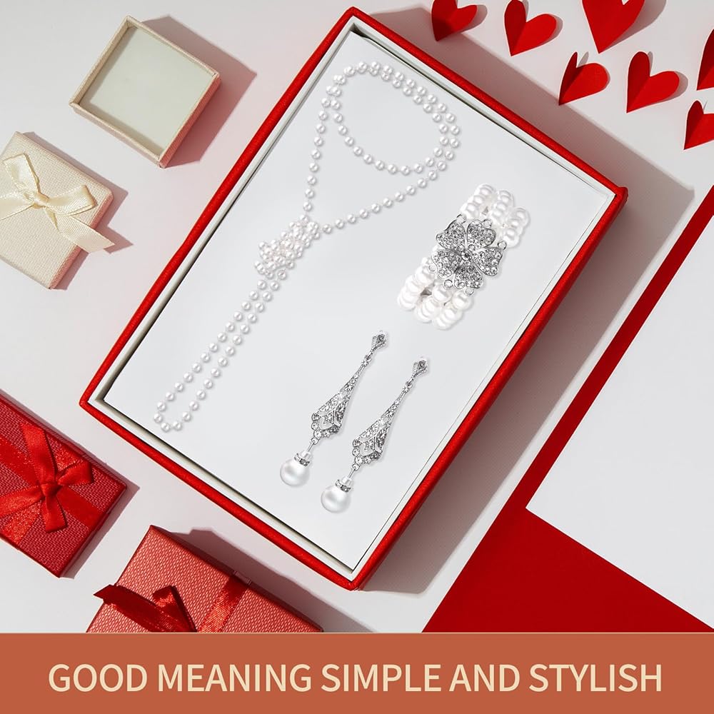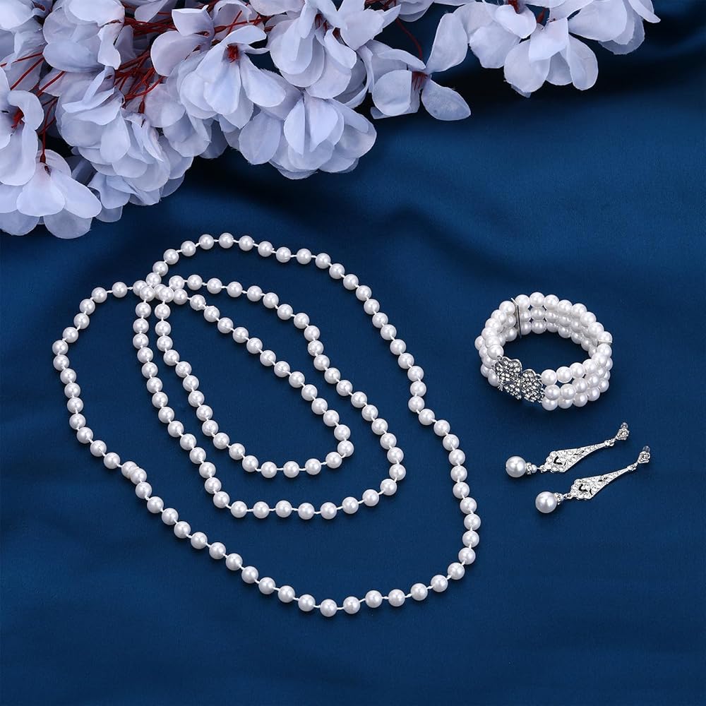 طقم مجوهرات من اللؤلؤ مكون من 3 قطع للنساء مكون من عقد واقراط من اللؤلؤ بتصميم عشرينيات القرن الماضي بما في ذلك اقراط فلابر عتيقة متعددة الطبقات من اللؤلؤ وسوار مجموعة اكسسوارات للنساء والفتيات هدية