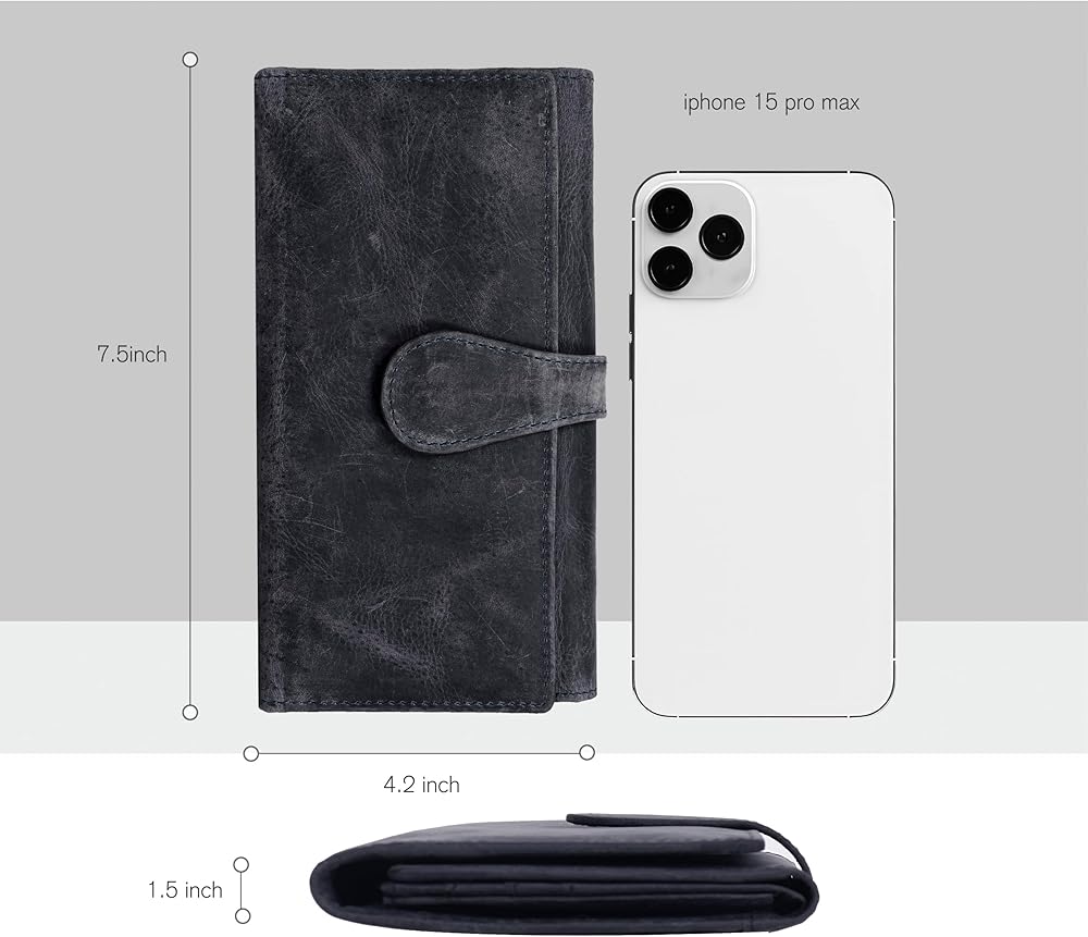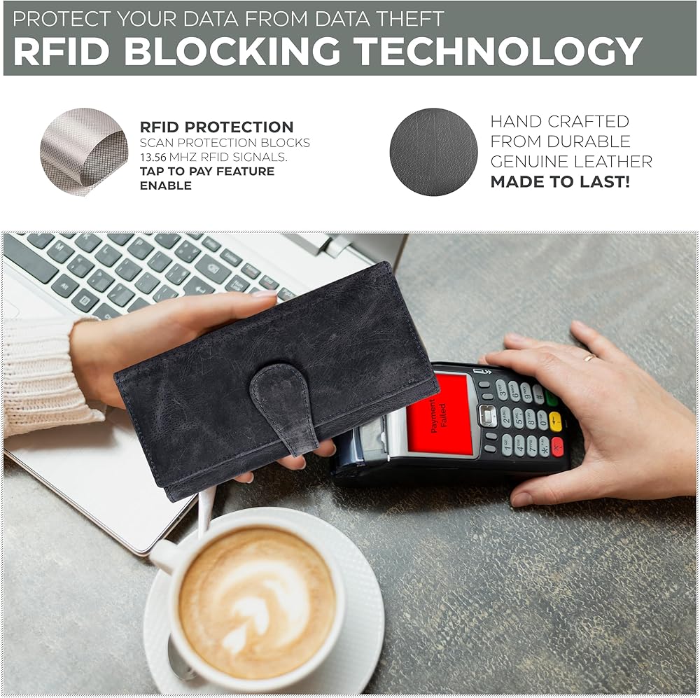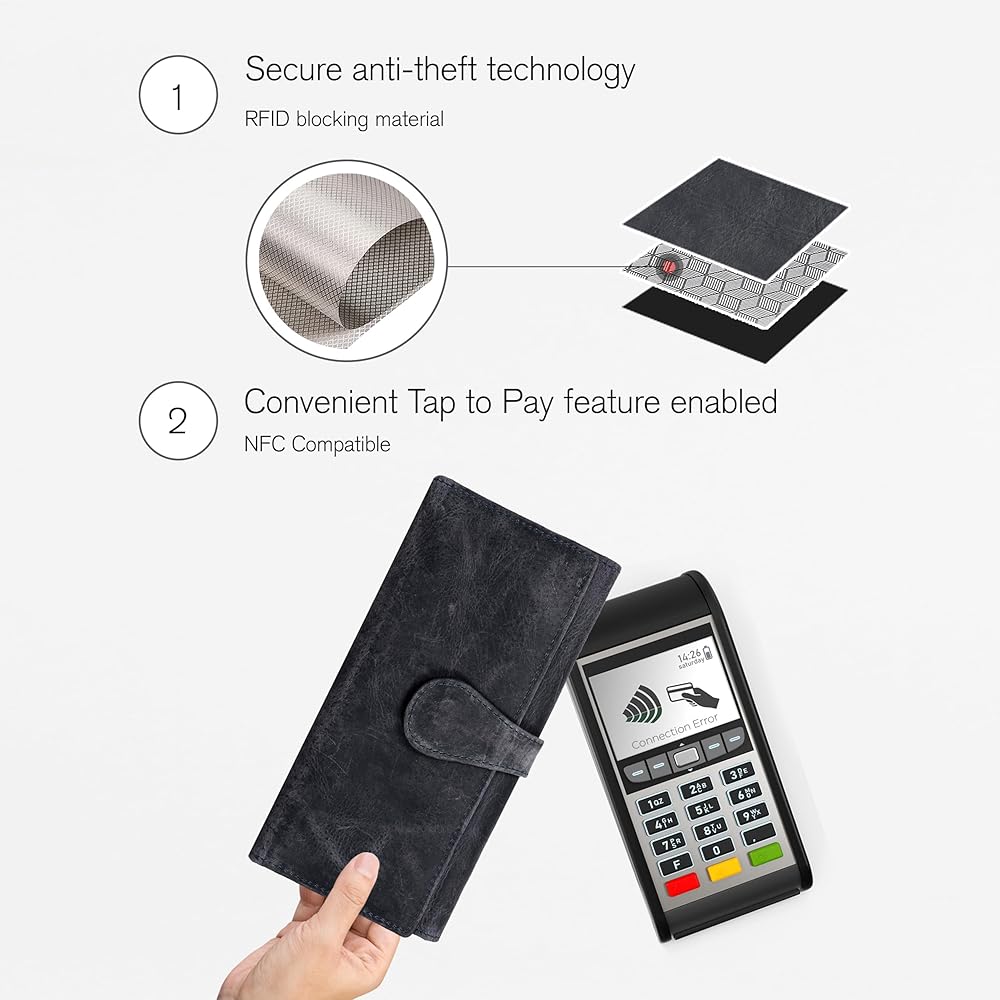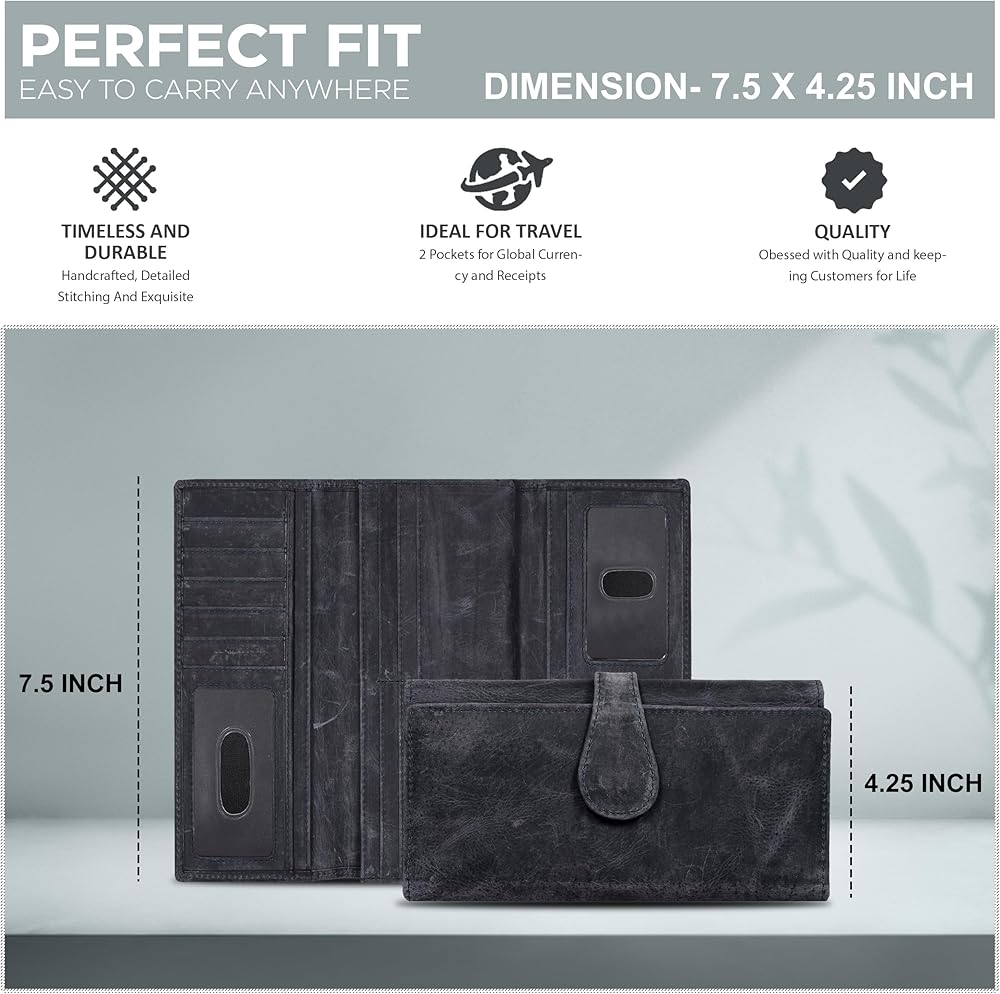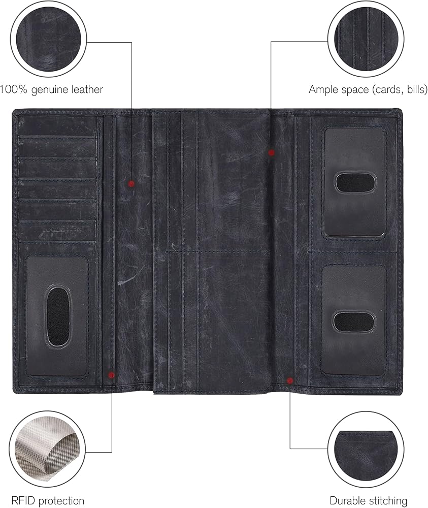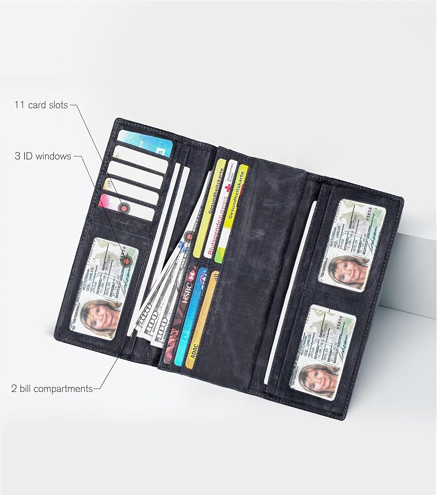 • تصميم ذكي: تتميز المحفظة الرفيعة للسيدات بتصميم فريد مع مساحة تخزين مذهلة: 3 نوافذ أمامية لبطاقة الهوية للوصول السريع إلى إثبات الهوية أثناء السفر، و11 فتحة للبطاقات للحفاظ على بطاقات الائتمان والخصم، و5 مساحات لإدخال النقود، الفواتير والمستندات الأخرى في مكانها.
