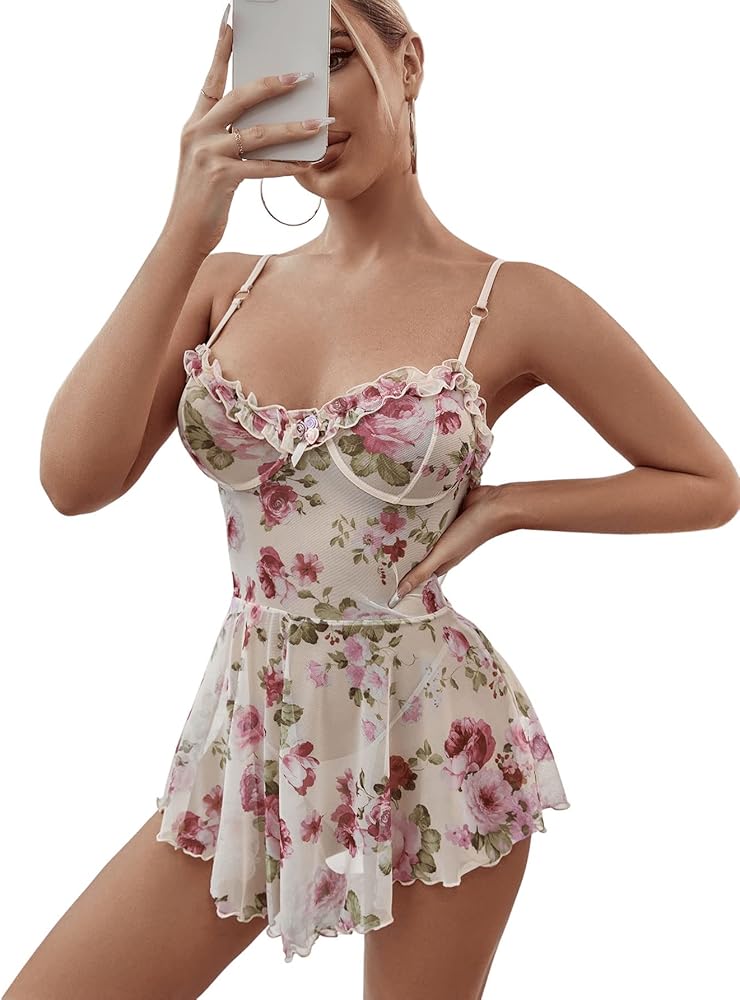 - التصميم: طباعة زهور، شبكة شفافة، زخرفة مكشكشة، بدون رؤية من خلالها