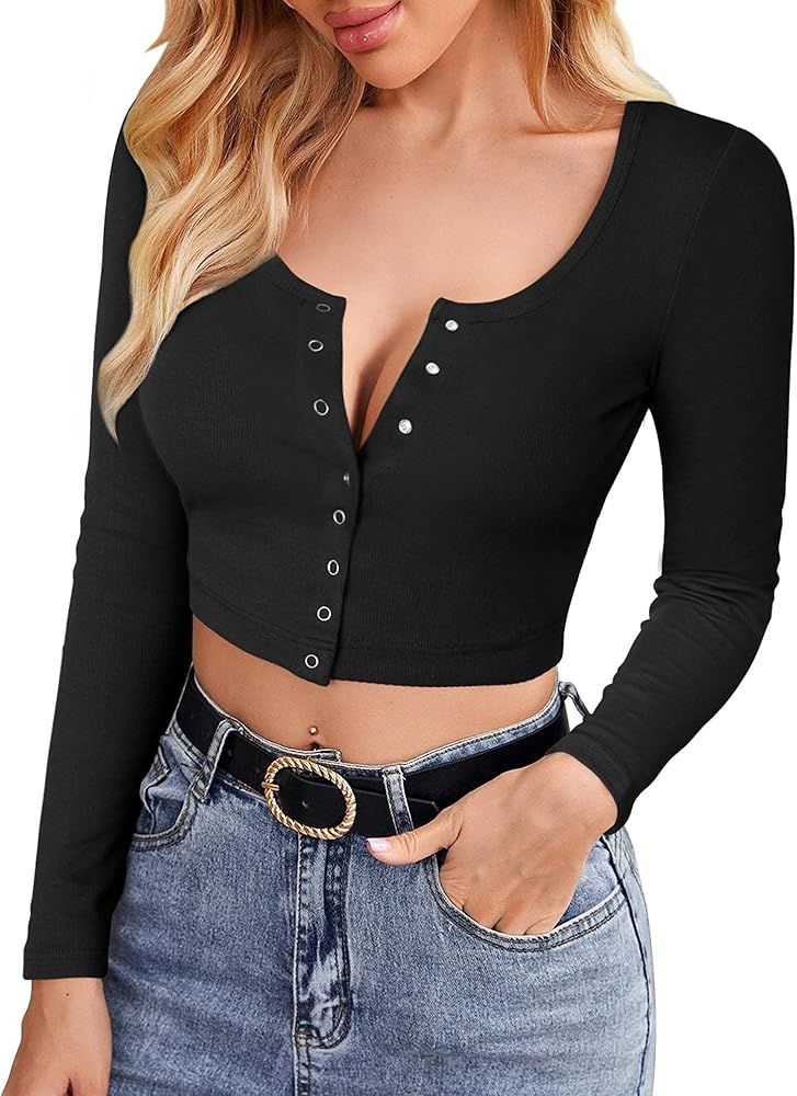 الميزات: قطع علوية قصيرة للنساء عصرية/أكمام طويلة، بلوزة قصيرة بأكمام طويلة وأزرار سفلية، قطع علوية خريفية للسيدات، بلوزة قصيرة مثيرة للنساء