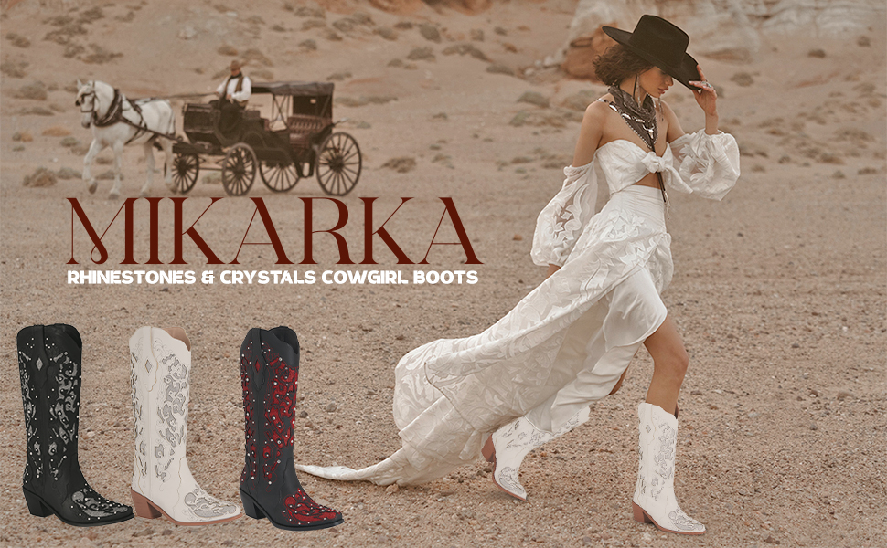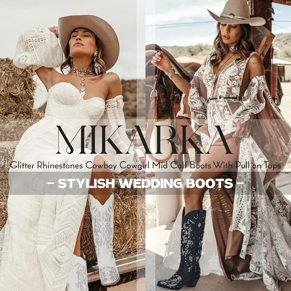 [النمط الغربي الكلاسيكي للركبة]: هذا هو النمط الذي يمكنك ارتداؤه طوال اليوم دون القلق بشأن التعب. اتبعت أحذية Mikarka راعية البقر التطريز الغربي الكلاسيكي الأصلي على العمود ومشط القدم وأحدثت ترقية فنية مع الحفاظ على تطريز الحذاء الغربي التقليدي، فهي تضيف عنصرًا كريستاليًا ومسامير من أحجار الراين مناسبة لملابس الزفاف. جميل ولطيف.