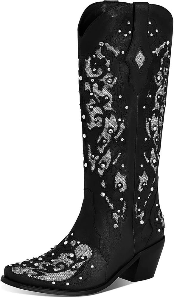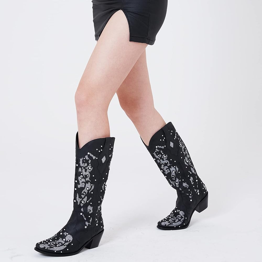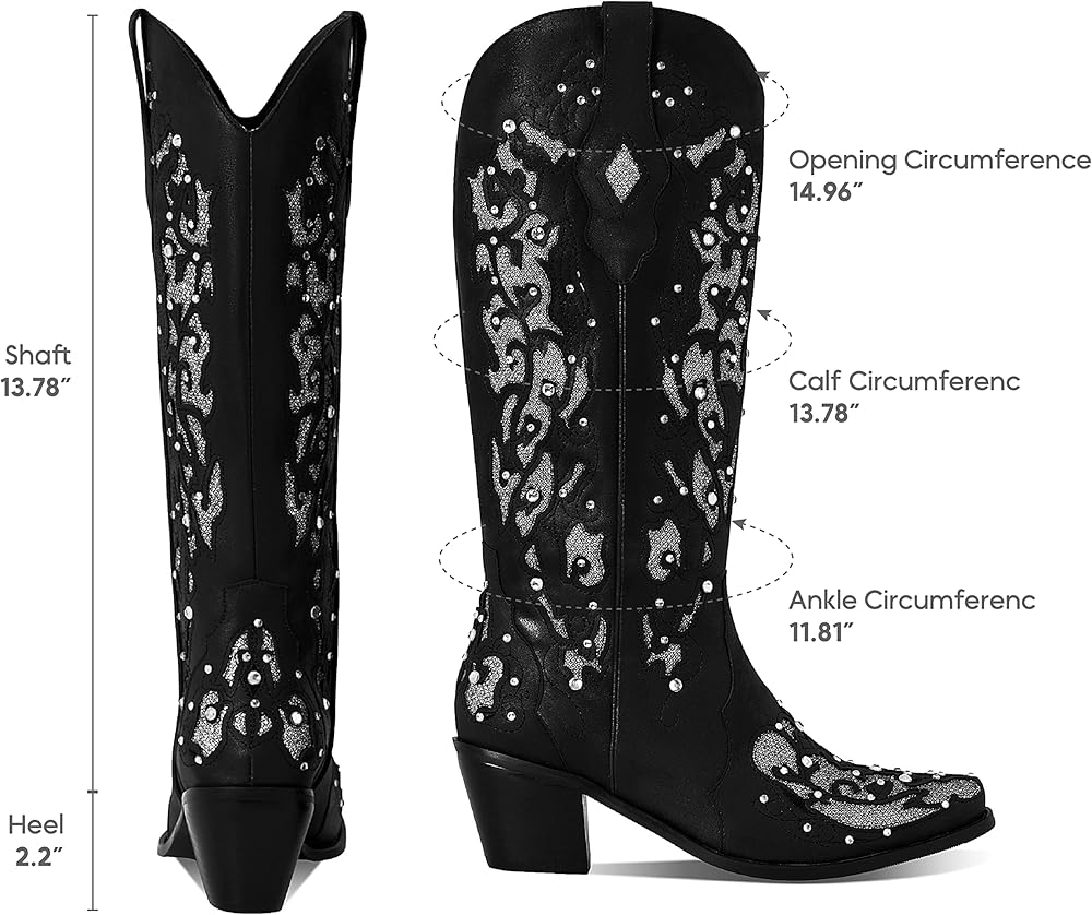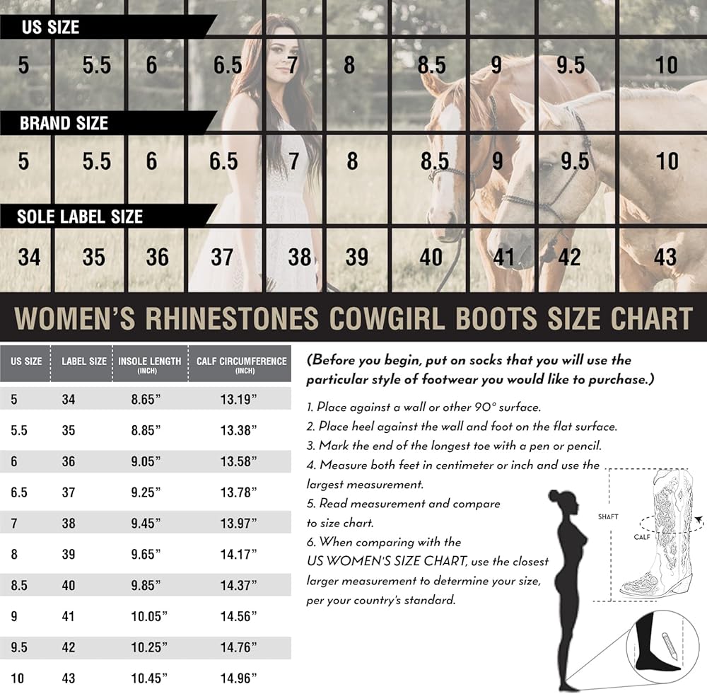 [نصائح ودية]: للحصول على ملاءمة أفضل، يرجى التحقق من جدول مقاسات علامتنا التجارية حيث يوجد في جزء الصورة أو قسم وصف المنتج قبل طلبك. نقترح طلب مقاس أكبر بنصف أو مقاس واحد إذا كنت تخطط لارتداء أحذية رعاة البقر هذه المصنوعة من أحجار الراين للسيدات من خلال جوارب سميكة أو أن قدميك وساقك أعرض من المعتاد.