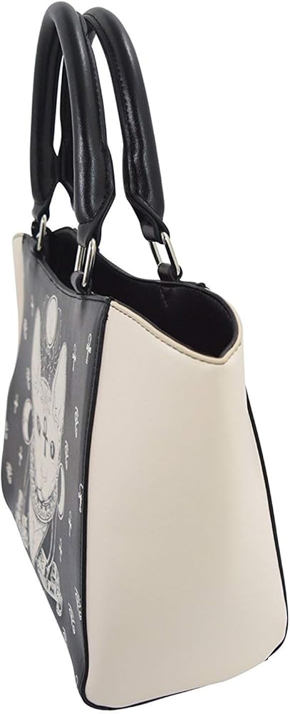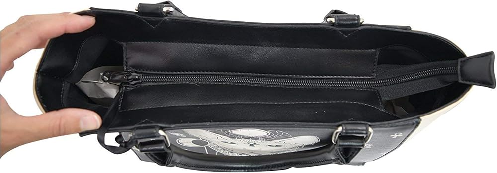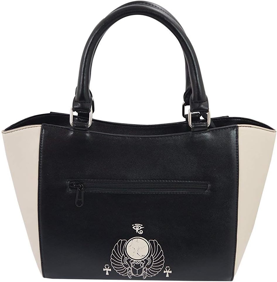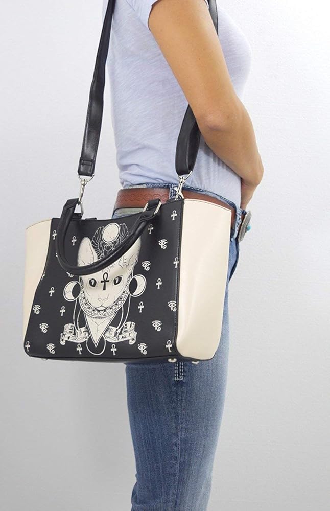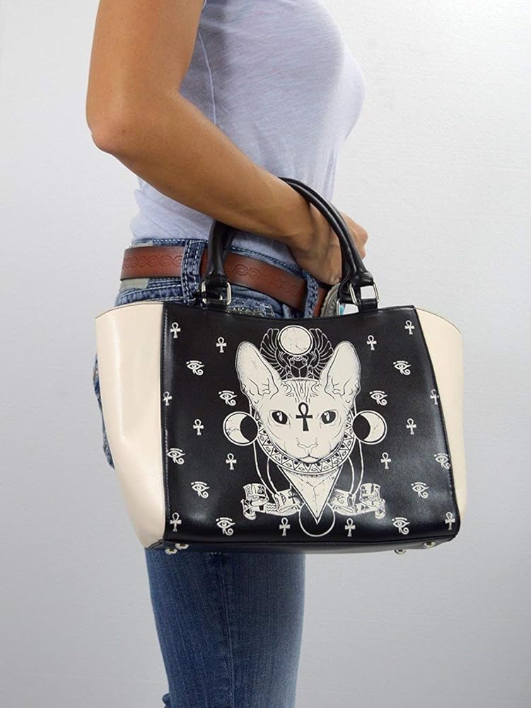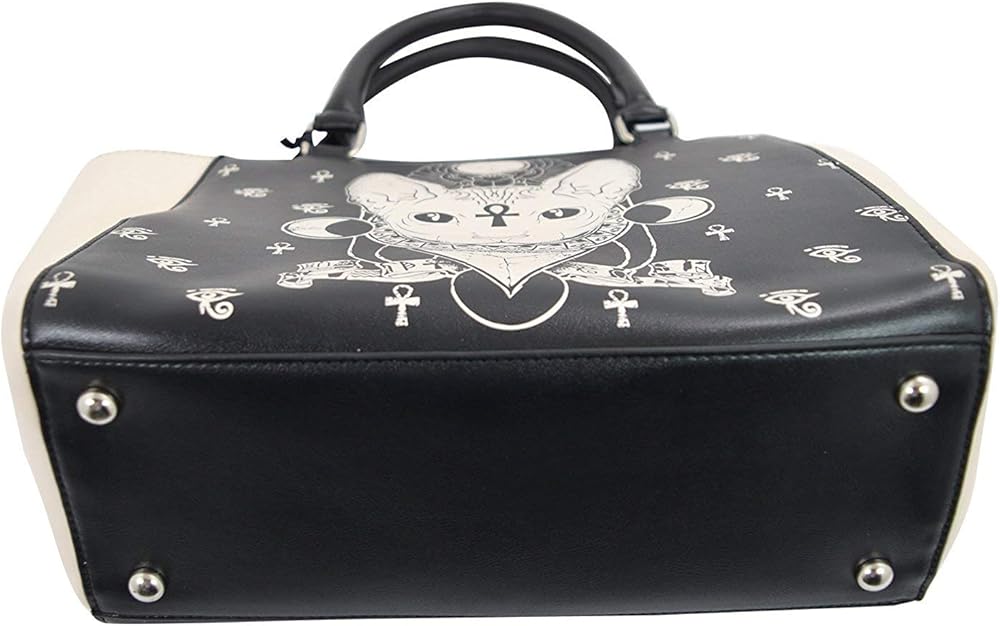 حقيبة يد بتصميم القوطي جيبسي جافت للأنظار مصنوعة من الجلد الصناعي. مقدمة وخلفية سوداء مع قطة سبنيكس كريمية من الأمام ورموز مصرية. جوانب بلون كريمي. ظهر أسود مع خنفساء كريمي وأجنحة إلى الأسفل. جيب خارجي بسحاب إلى الجزء الخلفي من الحقيبة. مقابض حمل سوداء مع حلقات معدنية. سحاب التثبيت، على الرغم من وجود فجوات مفتوحة صغيرة لكل جانب من جانبي السحب.