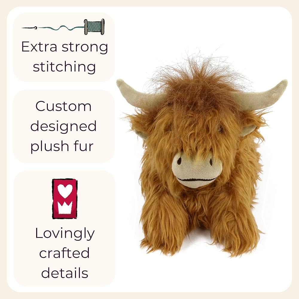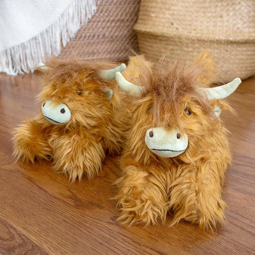 تفاصيل أصلية - مع معاطف الزنجبيل الصوفية المتموجة، تبدو هذه النعال المصنوعة من الماشية الاسكتلندية مثل الشيء الحقيقي تمامًا. قرون طويلة، وذيول غامضة، وآذان مرنة، وكمامات رائعة تكمل المظهر. عيونهم البنية الدافئة تطل من خلال الفراء الأشعث الإضافي.