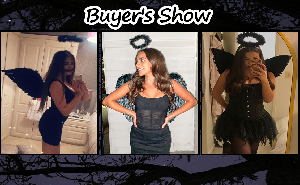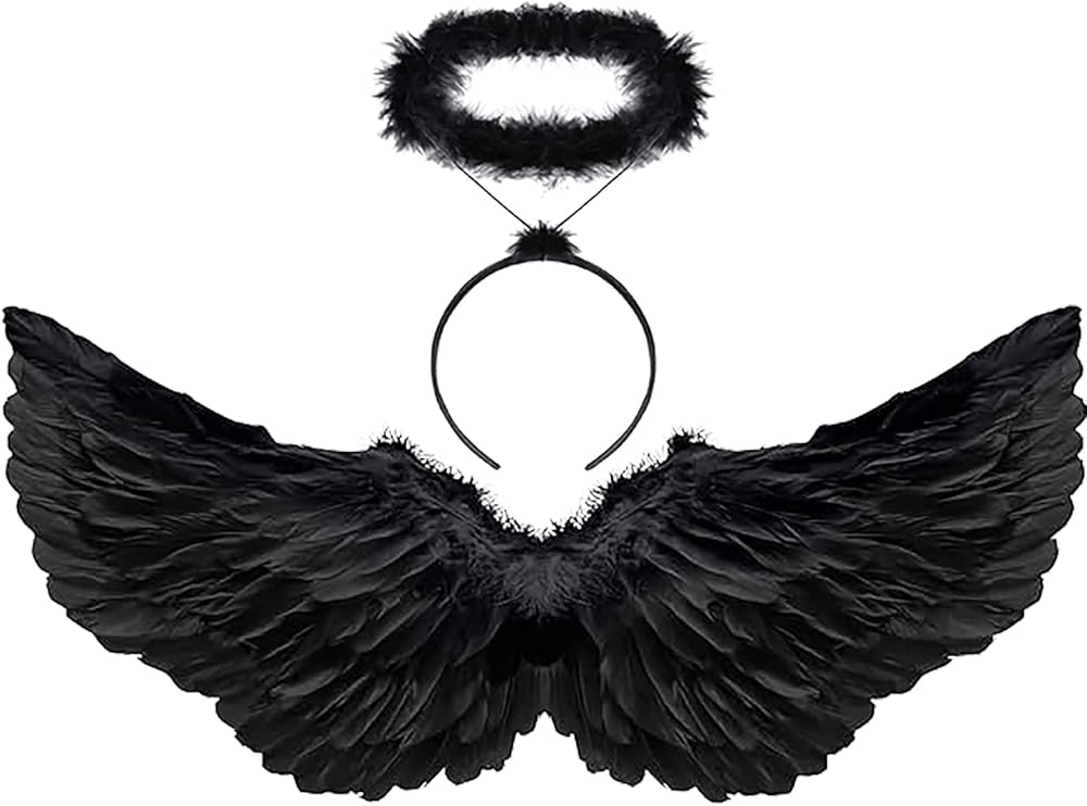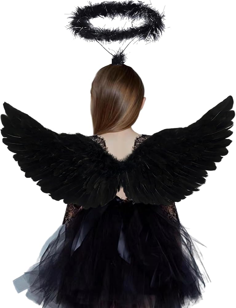 - The black angel wings and halo are made of clean and tidy feathers, which are glued by hand. Feathers are NOT EASY TO FALL OFF and DEFORM.
