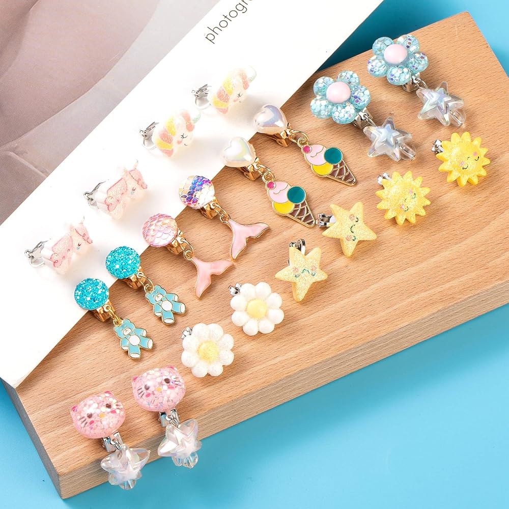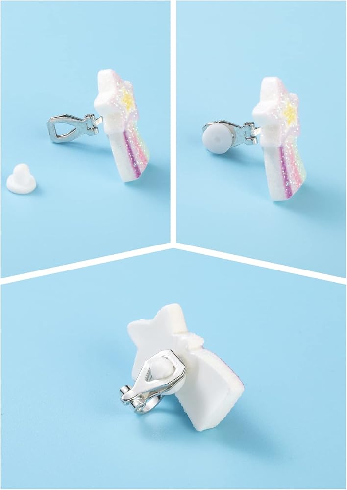 loremow 24 زوجًا من الأقراط المشبكية للأطفال للفتيات الصغيرات اللطيفة على شكل زهرة قوس قزح وحيوان وحيد القرن المتدلي للفتيات مجموعة أقراط غير مثقوبة للأطفال مجموعة مجوهرات لا تسبب الحساسية