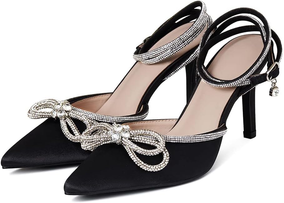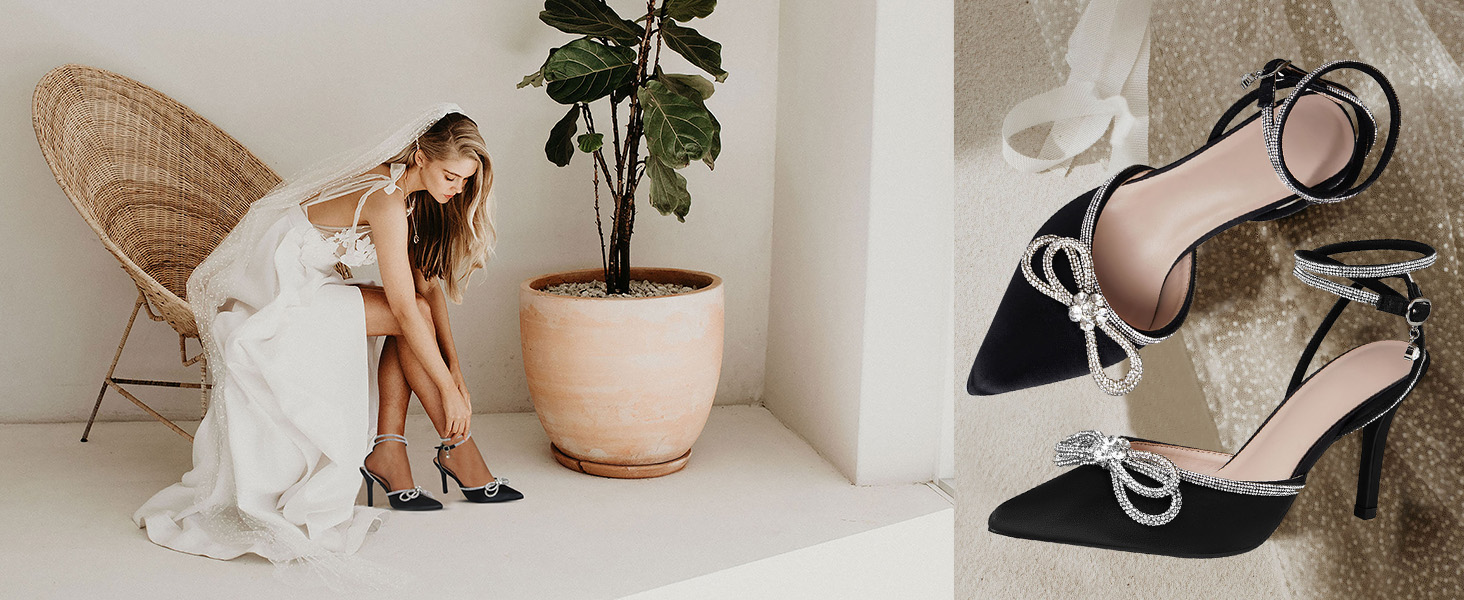 - *عنصر الموضة* أحذية الزفاف الرائعة التي تتميز بعقدة من حجر الراين، ورباط، ومقدمة مدببة، وكعب قطط