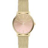 • تتميز بهيكل دائري من الفولاذ المقاوم للصدأ باللون الذهبي مقاس 36 ملم مع كريستال مقاوم للخدش وقرص ذهبي وثلاثة حركة يدوية